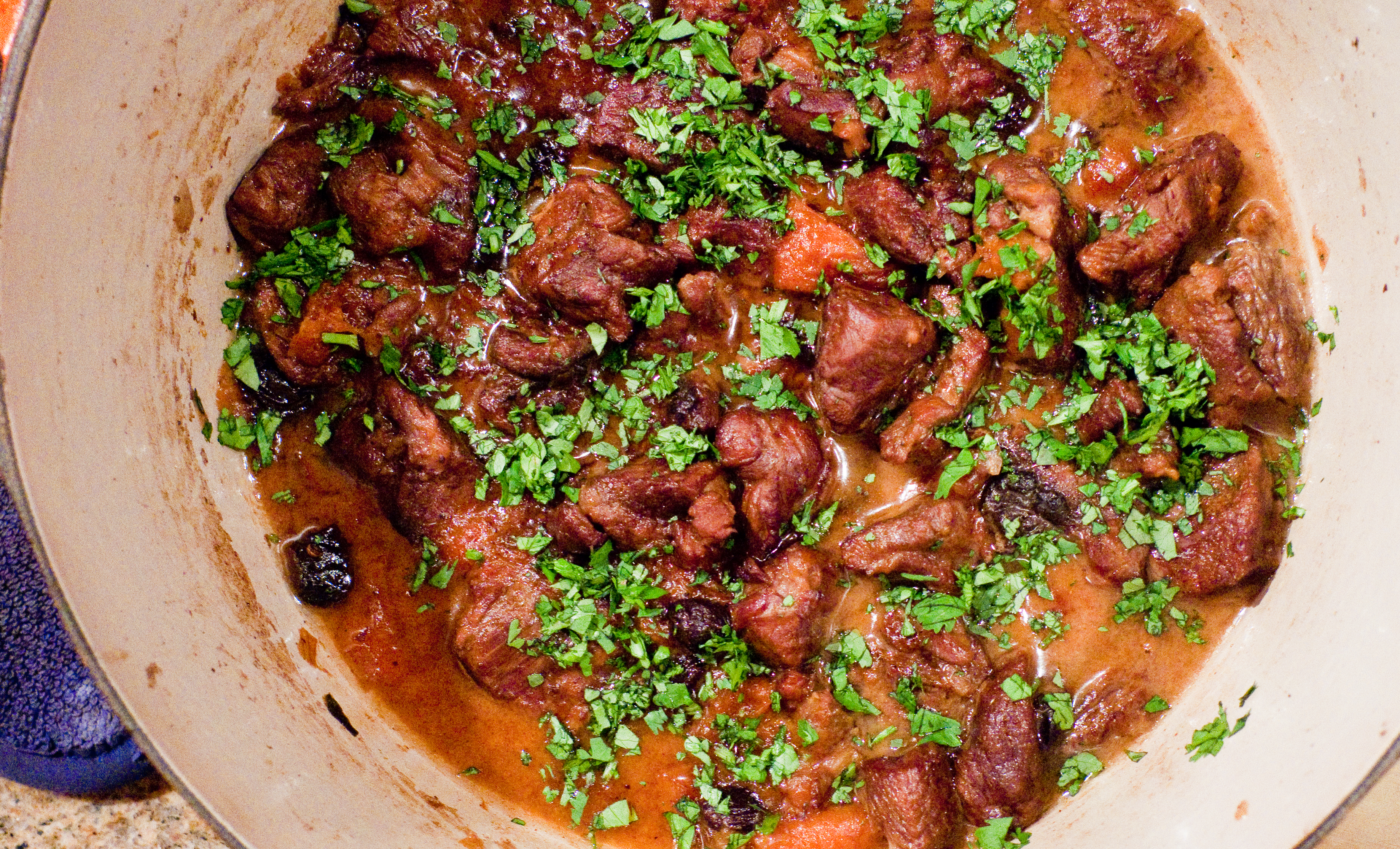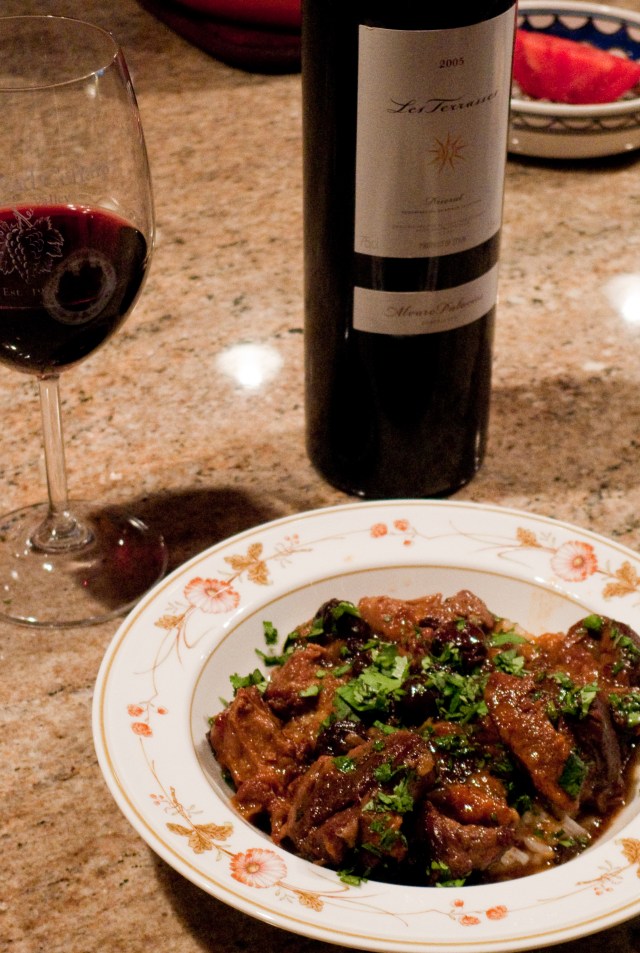 Since the origin of the dish is purported to be Eastern Spain, I selected a 2005 Priorat, Les Terrasses for the wine. It was good, though it was still a bit closed to match well with the dried fruit of the stew.