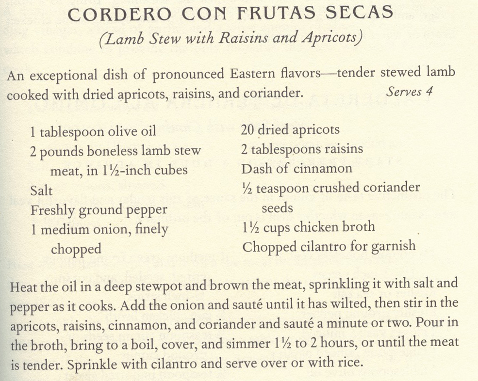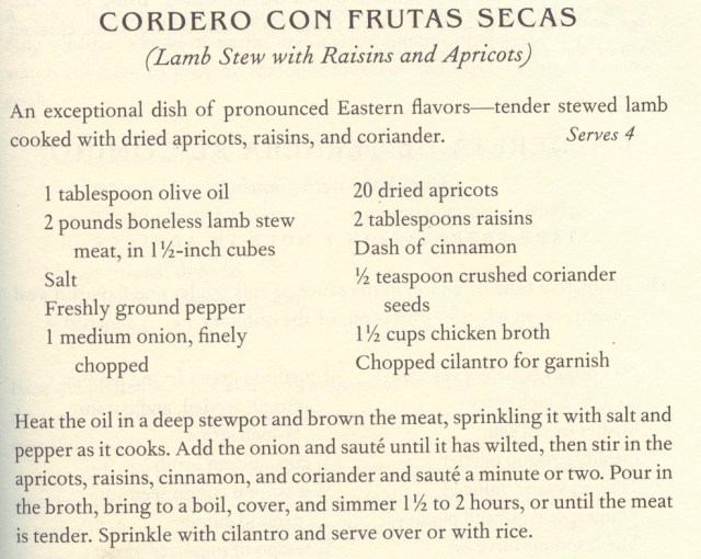 So, tonight, after dutifully working for several hours, posting all the readings for half of my Tufts course this Fall, I returned to my lamb friend and made my dinner. The main dish was a lamb stew from Penelope Casas’ Spanish cookbook, Delicioso!