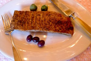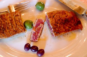 Seared tuna with a crust of Trapani sea salt crystals, black, chipotle and Maras peppers and finely-ground espresso beans