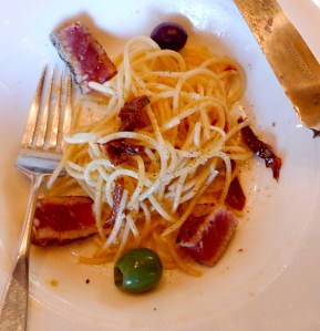 We have some good leftover roast chicken, but I decided on another plan. Turns out that I had a lovely piece of yellowfin tuna I needed to cook, plus some new condiments from gustiamo.com, including wicked good sun dried tomatoes and Colatura, a concentrated juice of salted anchovies.