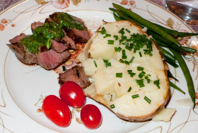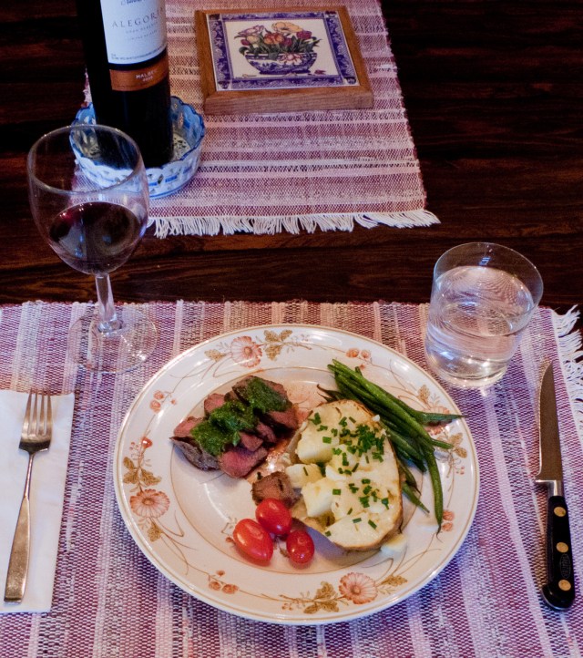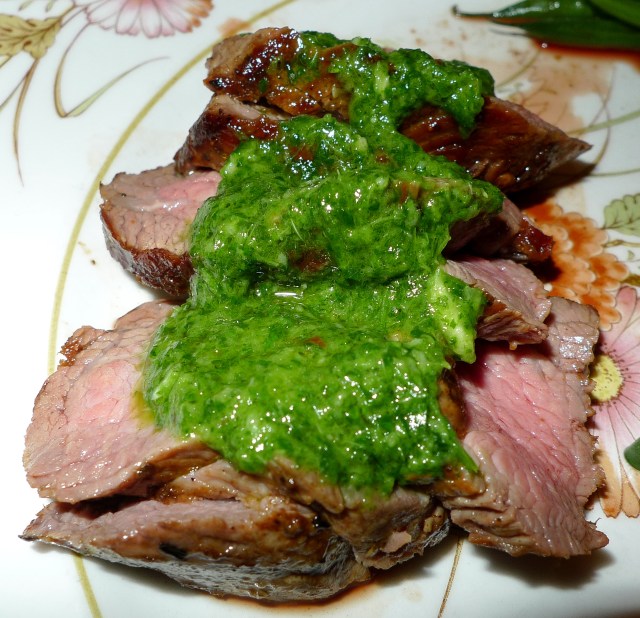 Last night the trusty Internet gave me the answers. This is a relatively new cut, also known as “Petite Tender“. And the answer is grill/roast, and I did so, with two half-pound chunks, topping with a garlicky Argentinian Chimichurri Sauce, accompanied by an excellent Malbec. The felicitous results are shown below:
