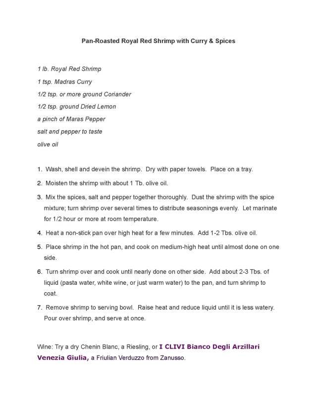 Tonight we had another Venetian-inspired dinner, this one with Laura and Michael. First course was the Pasta with Maitake Mushrooms of a few weeks ago, and the main dish required some invention with the shrimp we had in the freezer — Royal Red Shrimp from Whole Foods — a tender and flavorful crustacean if there ever was one. In keeping with the theme of the region, the key spice was a light touch of curry powder and ground coriander, enhanced by my two favorite secret spices: Maras Pepper, and freshly ground Dried Lemon. Laura made the Zucchini in Umido, which complemented the shrimp perfectly, and Barbara contributed fresh strawberries and homemade cookies for dessert.