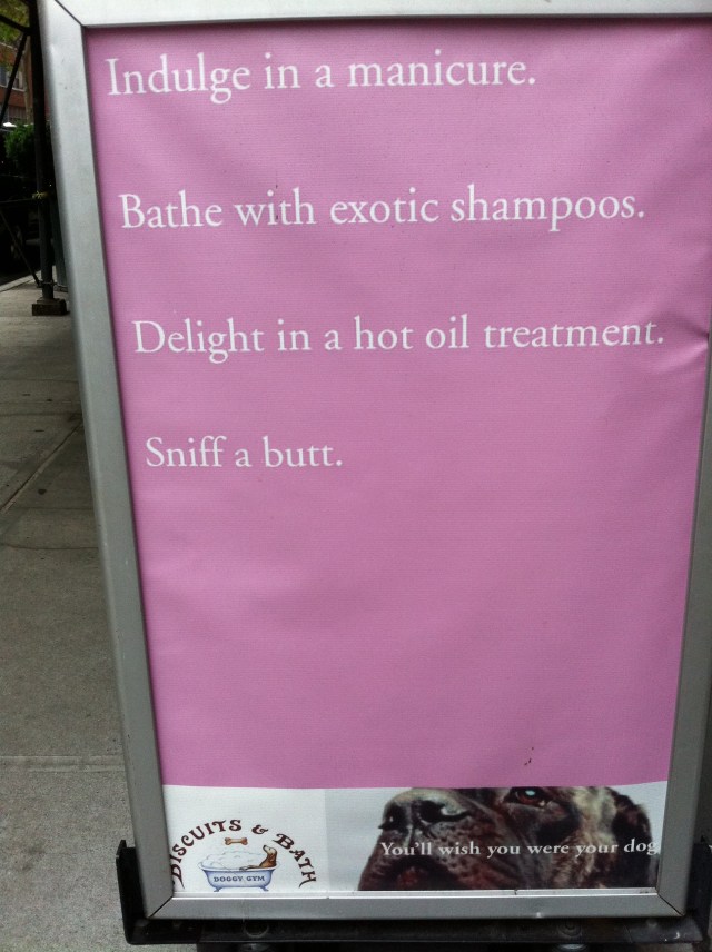 Strolling along 13th Street the next day, I saw young adults in casual but consistent outfits, each walking a string of dogs. As I followed their progress, it led me to a small, street level entry for Biscuits & Bath Doggy Gym — a fairly fancy retreat/overnight accommodation for canine creatures. I particularly enjoyed the billboards in front: