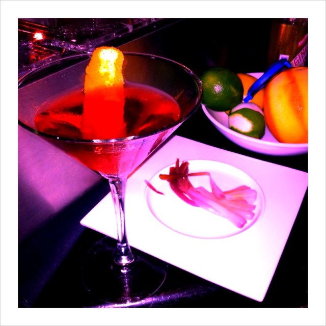 I’m pleased to say that each was accomplished with gusto. Emblematic of the color and style of the gustatory delights is the photo above — a Negroni along with a plate of Pickled Ramps at the bar in Gramercy Tavern on Saturday night.