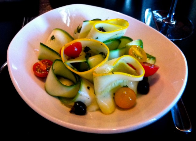 She had a salad with arugula and other greens, a salmon fillet and a glass of Prosecco. I was able to stay vegan by eliminating the cheese in a delicious salad of zucchini strips, cherry tomatoes and what appeared to be Gaeta or Taggiasca olives, followed by a bowl of spaghetti with eggplant, tomato sauce, and a bit of hot pepper flakes.