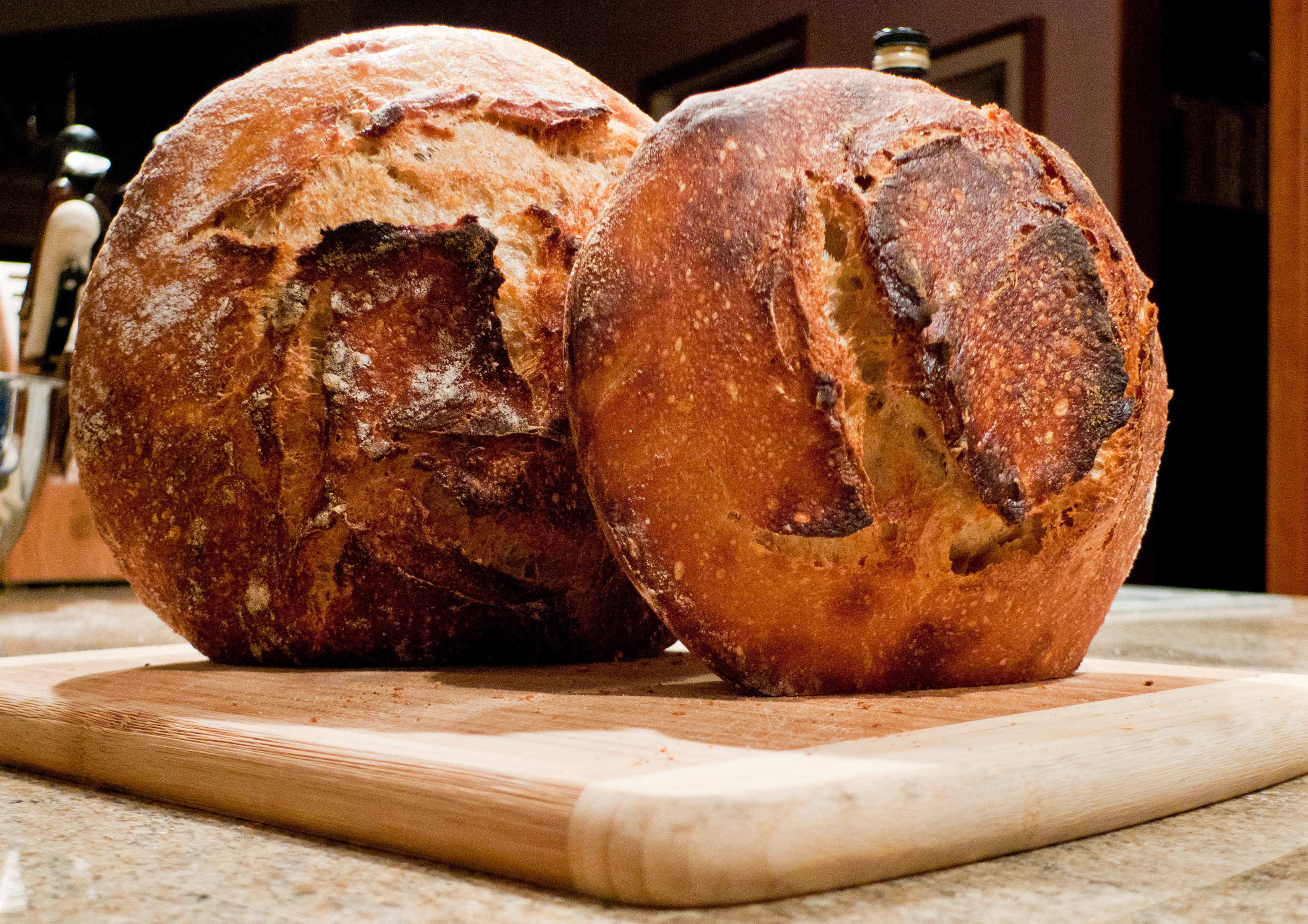 The first of the two batches was with unbleached bread flour and organic whole wheat in the ratio of 70%/30%. The basic Tartine recipe calls for 90% all-purpose flour and only 10% whole wheat, but I keep edging up the whole-grain content, with good results. For comparison, the second batch was done with all-purpose flour and whole wheat in an 80/20 ratio. I had to cheat a little and make the second batch smaller (so as to preserve a little of the leaven to continue my starter), so those loaves were 15% smaller, but the texture difference was not affected by that.