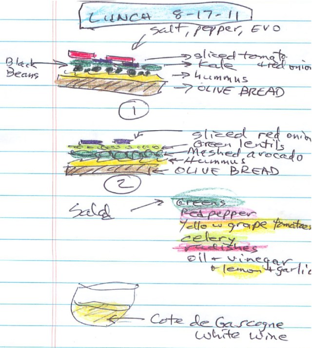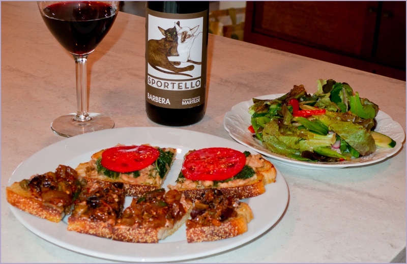 Caponata and white bean puree (leftover from the birthday party), plus bean puree, topped with kale from Lynn’s garden and sliced Bartlett’s tomatoes, served with a Sportello private-label Barbera from Martilde: