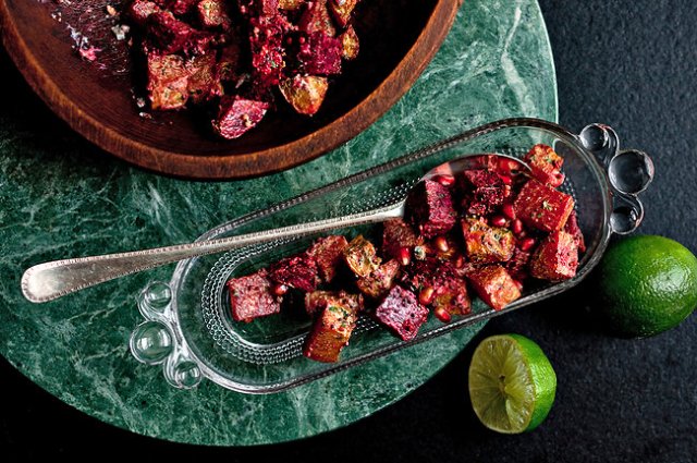 The two new recipes I want to share with you are the first two dinner items. The beets were from Melissa Clark in The New York Times on October 7th — this article followed by her recipe. Her photo is below; our version used a soy-based “sour cream” instead of yogurt, and some Maras pepper flakes instead of hotter fresh chiles, but looked similar.