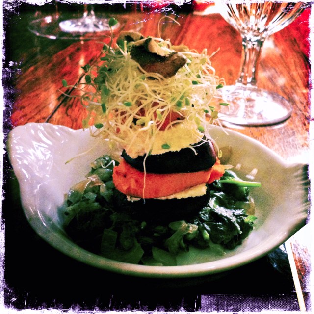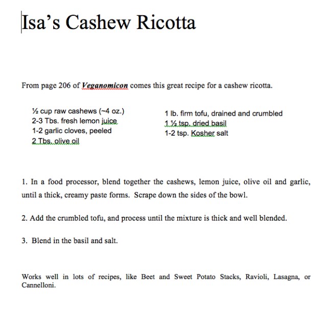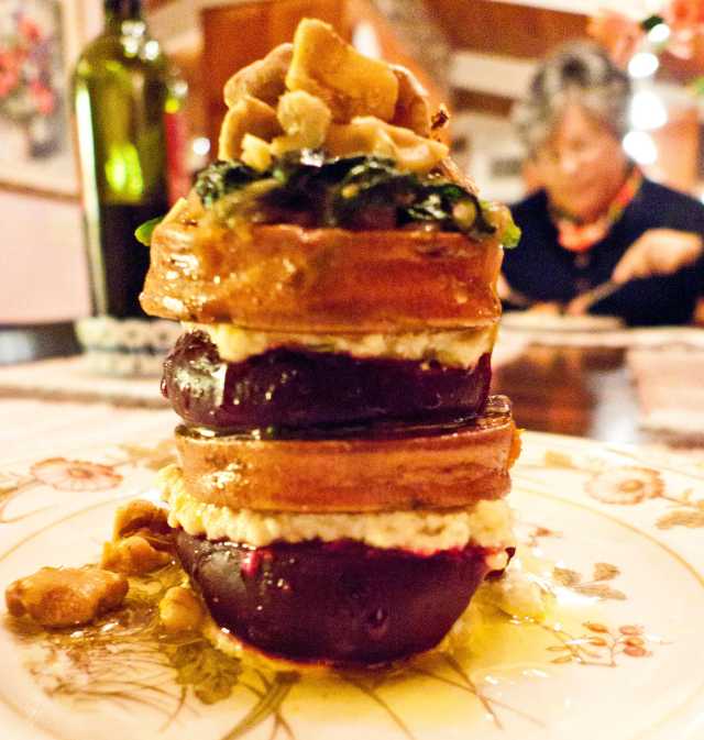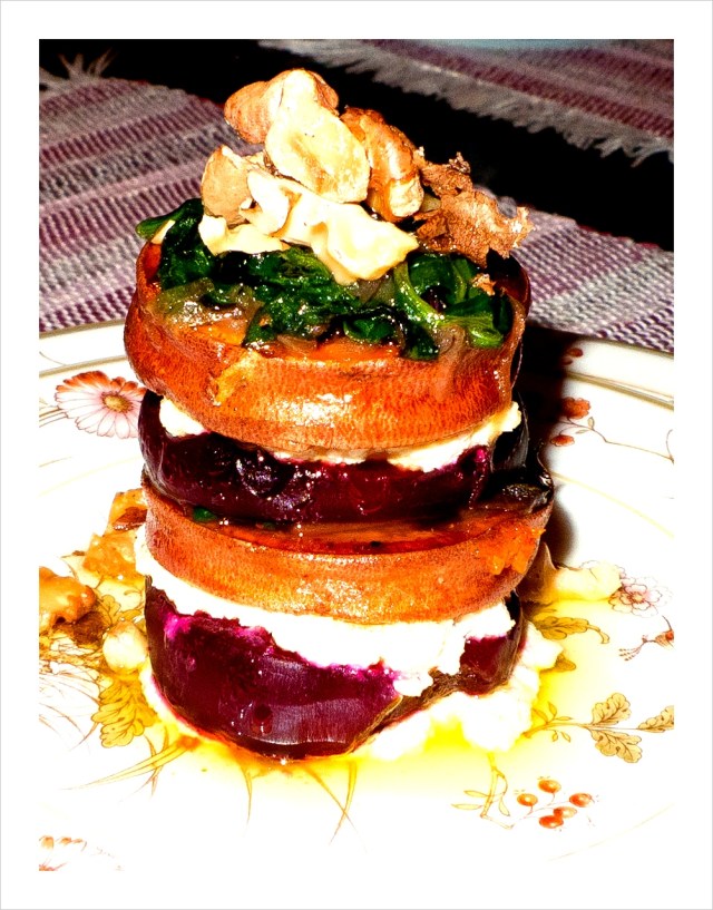 I almost forgot one other delightful vegan dish we discovered this Fall: Sweet Potato – Beet Stacks. The original recipe (non-vegan) was here on the web. I substituted Isa Chandra Moskowitz’s Cashew Ricotta for the goat cheese, and we were good-to-go.