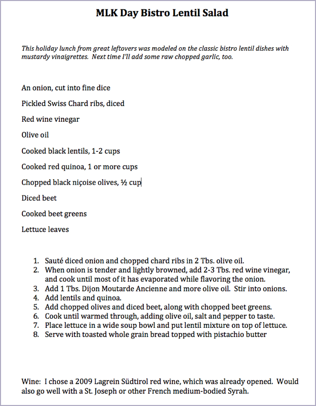 Great vacation, but it’s also nice to be back home again in my own kitchen. For no particular reason other than it was Martin Luther King Day on Monday, I made (and want to share with you) a delicious and wholesome lunch. It was a cold day that was reminiscent of March in Paris, and my thoughts went immediately to bistro food. The dish that came about as a result was a salad of organic black lentils, red quinoa, beets and beet greens, and nicoise olives, all melded nicely with a mustardy vinaigrette, on red leaf lettuce. Some of my pickled chard ribs added a nice bit of tang to the salad. An extra fillip was some whole wheat sourdough toast with pistachio nut butter for contrast.