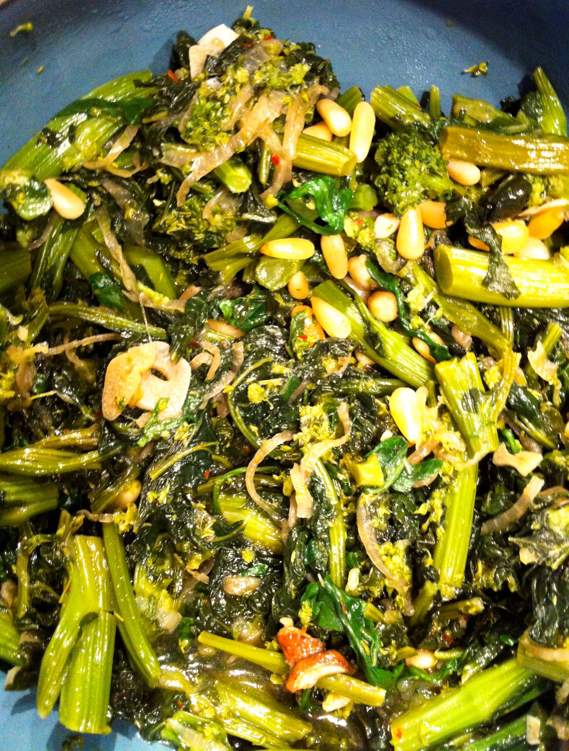 In the afternoon I did my vegetable shopping, and returned to do cooking for dinner. First, I needed to remedy the greens situation, so I cooked in succession Swiss Chard, Red Kale, and Turnip greens, using the same pot of water for fuel efficiency and a little flavor-mingling. These were set aside for Sunday’s grilled bread and bean puree.