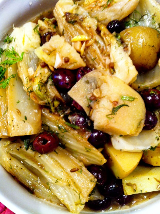 Next, since it was cool, gray, and slushy — typical March in New England — I turned to Molly Stevens for a couple of hearty vegetable braises as a first course for dinner. One was done with wedges of fennel, browned in olive oil and then braised with garlic, thyme, coriander, fennel seed, an anchovy fillet, pitted Nicoise olives, white wine and homemade vegetable stock. I added a few small Yukon Gold potatoes as well, since they taste so good with fennel.