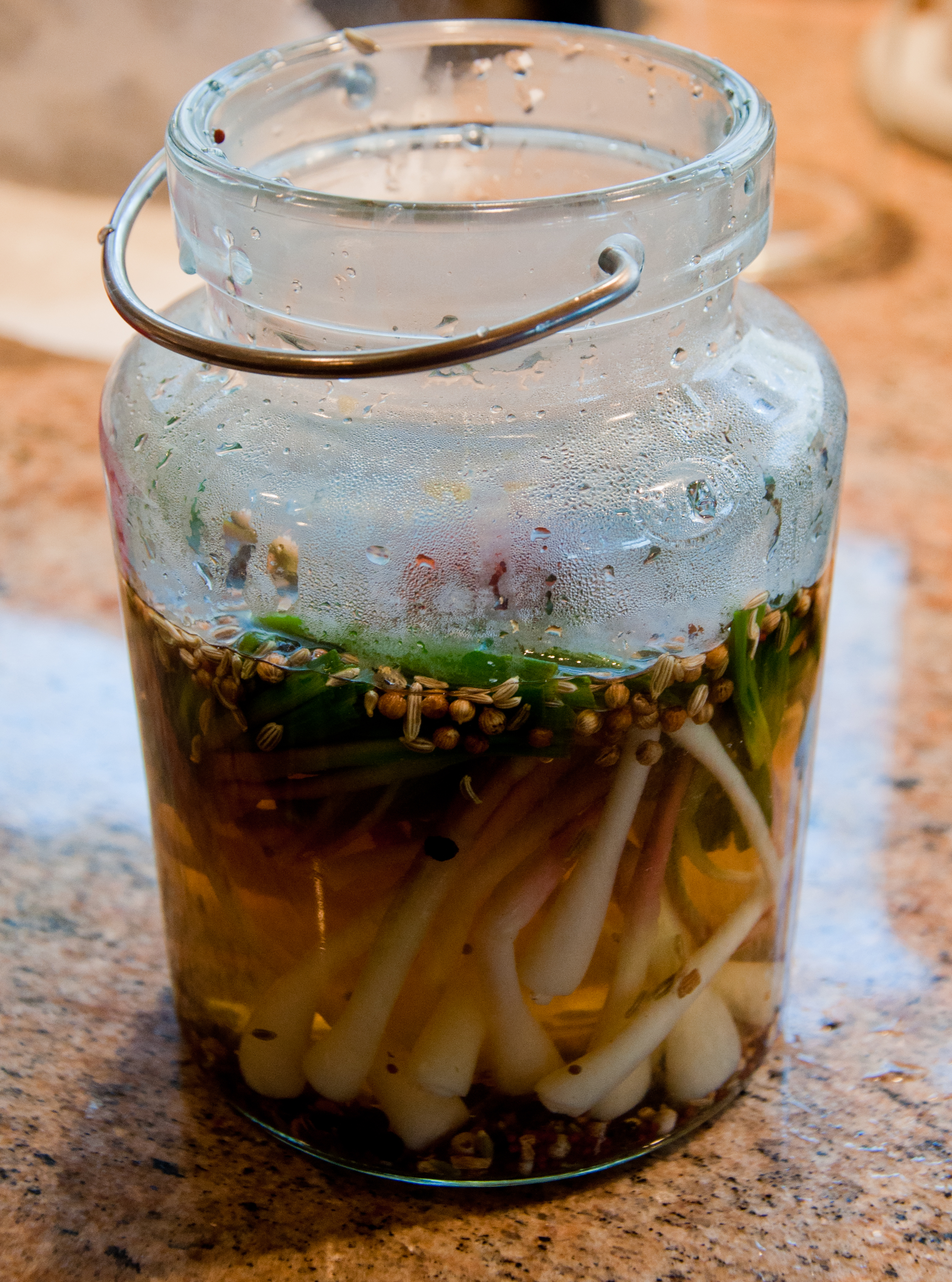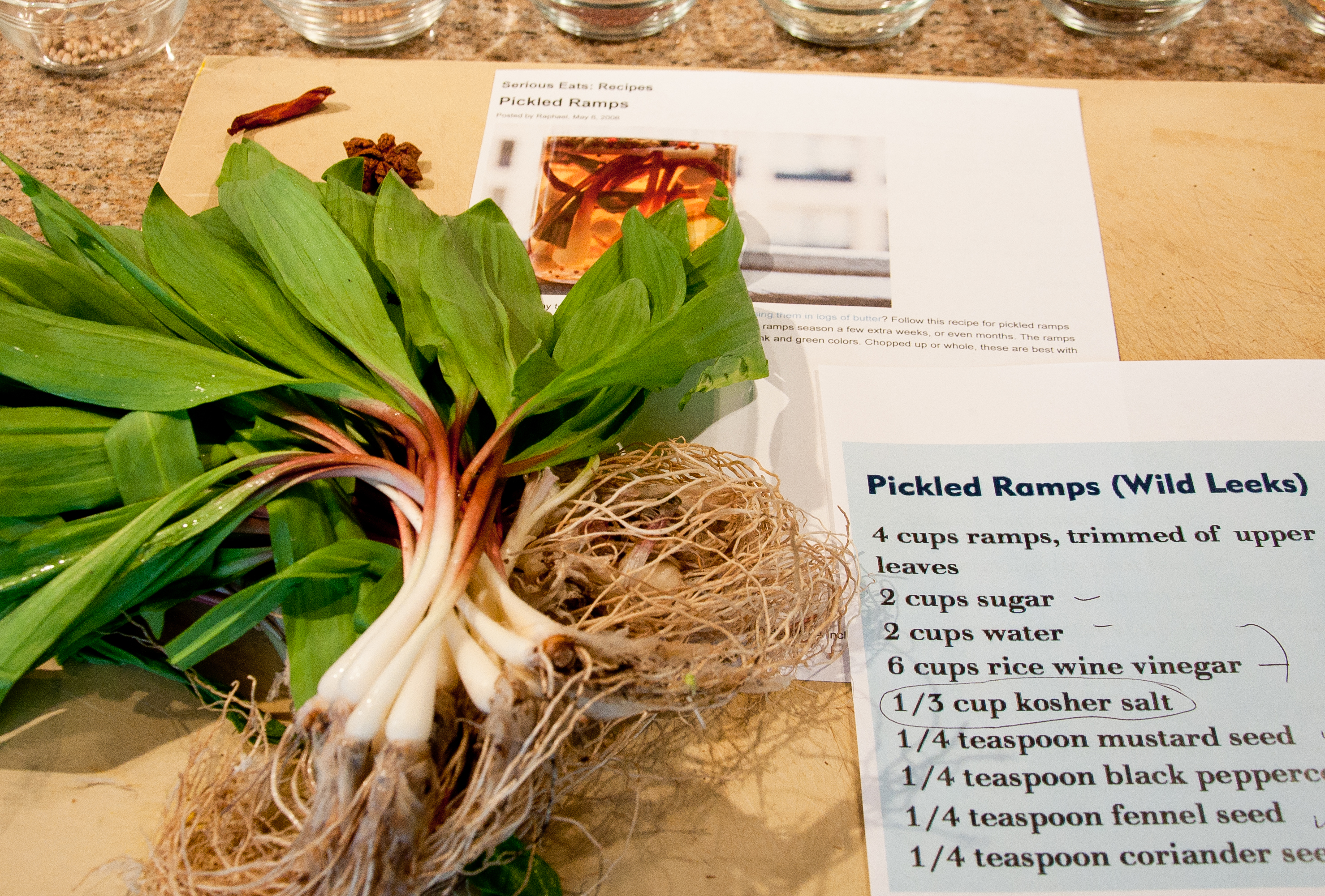 But until yesterday, I had never pickled them myself (although on rare occasions, I myself have been pickled). On Thursday I found some beautiful fresh ramps on sale at Russo’s, so I bought three bunches. After discovering at least seven different recipes online (among them is one from Chef Anthony), I studied the common and different elements, and then selected an approach that seemed appropriate.