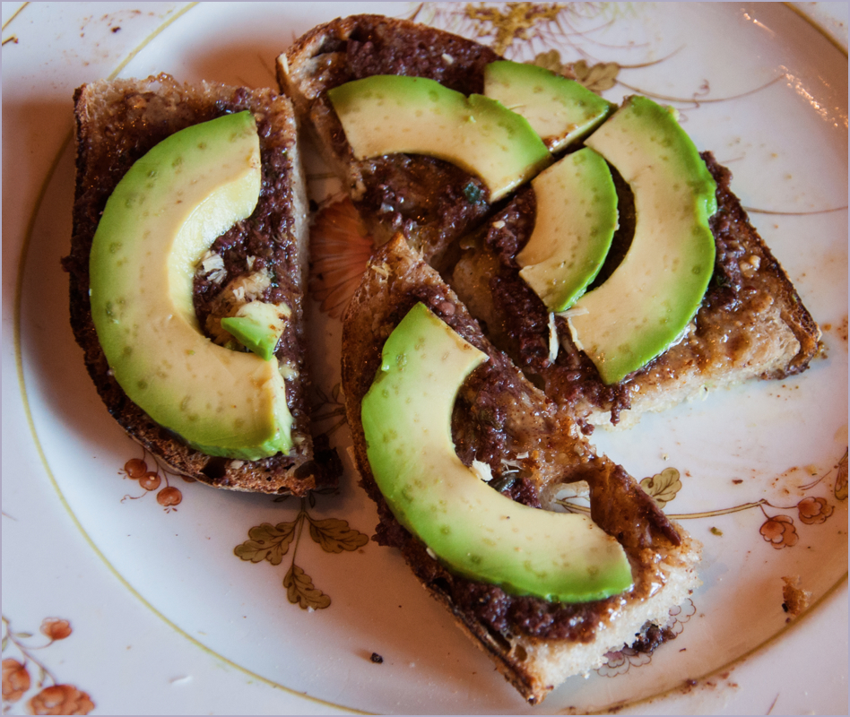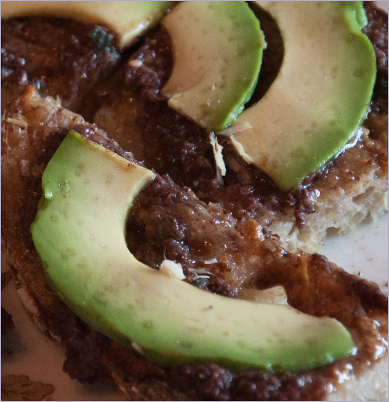 However, that’s not my story today. Instead, it is about lunch and an experience of umami flavors and texture of the kind not normally associated with vegan dining. It was simply an open-faced sandwich made with two slices of fresh bread, layered with Fastachi Pecan Butter, then Cibo Tapenade, flecks of freshly-ground horseradish root, and then topped with thin slices of a perfectly ripe avocado.