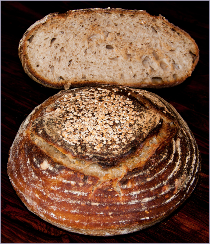 I’ve been making Tartine bread for almost a year now, always starting with Chad Robertson’s designs and then improvising on the proportions and ingredients. Today I finally made his Basic Country Bread almost exactly as written. (I say almost because my container had 884 grams of white bread flour in it vs. the prescribed 900 grams; so I ground 116 (instead of 100) grams of whole wheat flour to make an even 1000. And, for taste reasons alone, I use 24 grams of salt, 4 more than called for.) The two loaves are superb.