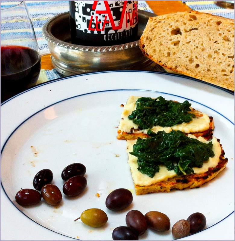 - Spread a thin layer of tapenade on one piece, not on the other (just for contrast). Top with a thick layer of bean puree, followed by chopped beet greens, sauteed in olive oil and seasoned with a good sea salt.