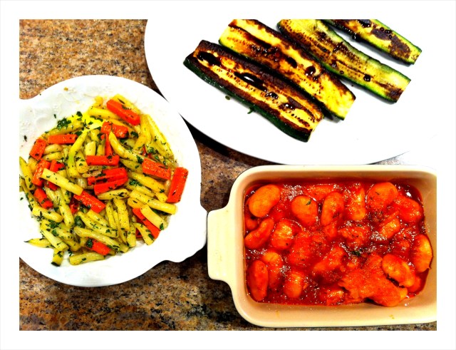 In mid-July the local farm stand offered their own butter beans (or wax beans, as I would know them), and I made a dish wish sauteed carrots along with a plate of grilled zucchini with a balsamic drizzle, and imported Greek beans with tomato sauce (from a can!):