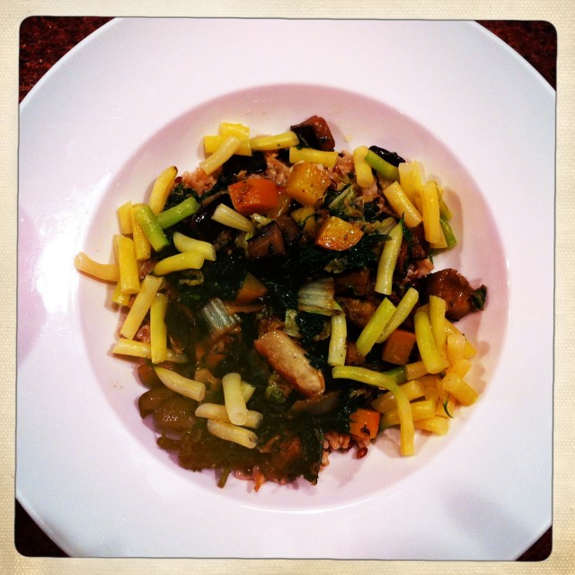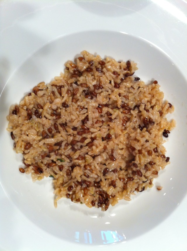 Those same wax beans provided another good dish, starting with a base of brown rice and black barley, cooked separately and mixed. Then a vegetable medley with zucchini, beets, swiss chard, and turnips was pan-roasted and placed on the grains:
