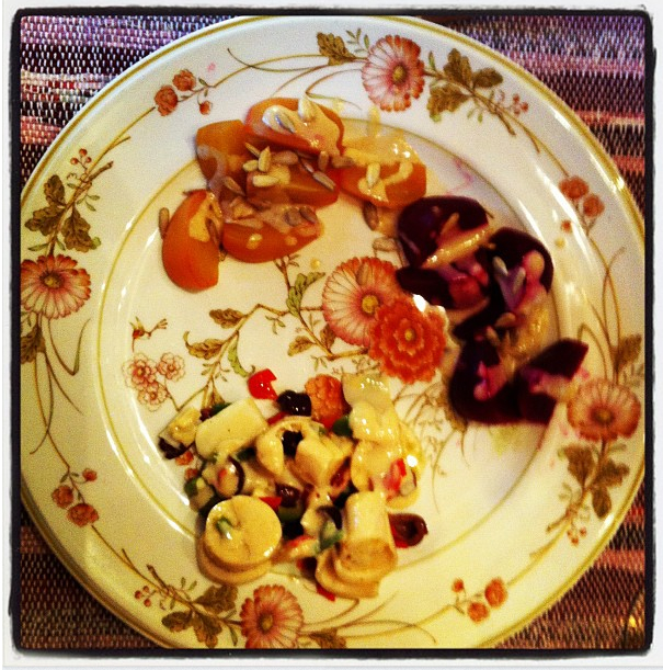 Vegetables have been plentiful and gorgeous this summer. One of my suppers started with a first course of beets, hearts of palm, peppadews, olives, and tahini sauce: