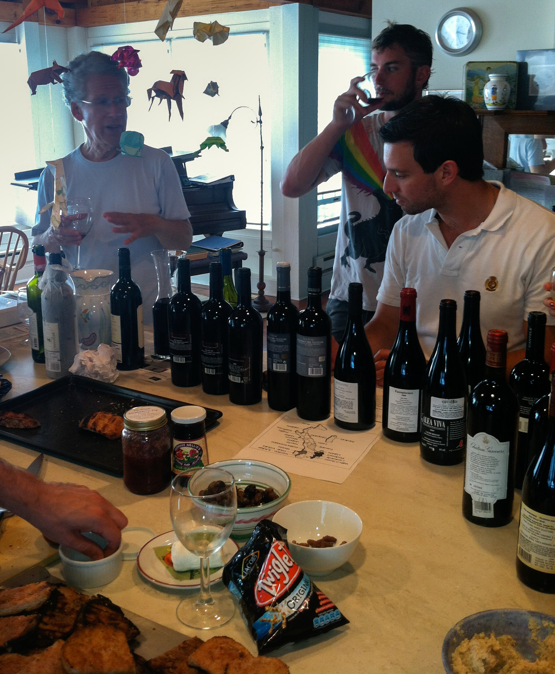 One of the great joys of summer is the arrival of Aaron and his friends on the island, for our annual wine tasting event. What began as Wine 101 one evening many years ago has progressed through various stages, to a four-day food and wine / family and friends celebration. This year was particularly special since Sarah, Nathan, and the D Boys were also visiting at the same time. Our wine focus was on 14 wines — mostly of Southern Italy, where Aaron and I had been (Puglia and a touch of Basilicata) this Spring. For good measure, I threw in a couple of older Bordeaux wines from my cellar.