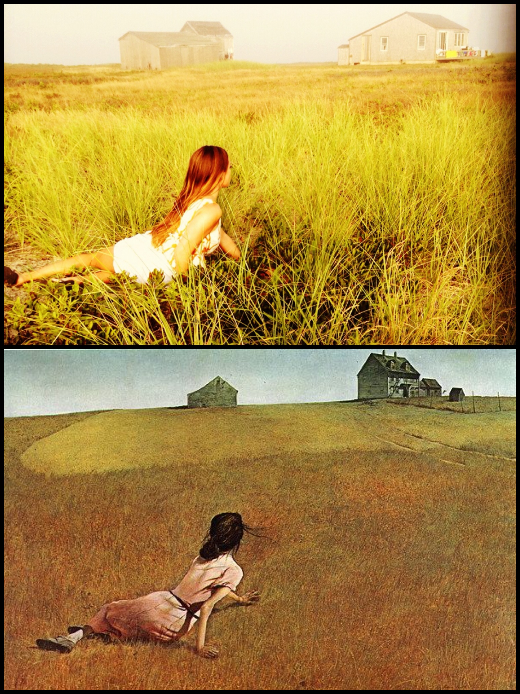 One of the new members of the club is Patrick, a friend of Jeremy. His creativity was inspired one afternoon, when he looked at our cottage and associated shack from the vantage point of our main deck. He envisioned Andrew Wyeth’s Christina’s World painting from that landscape, and then enlisted Molly as the model for his own replica. The resulting compare-and-contrast image, below, is astonishing: