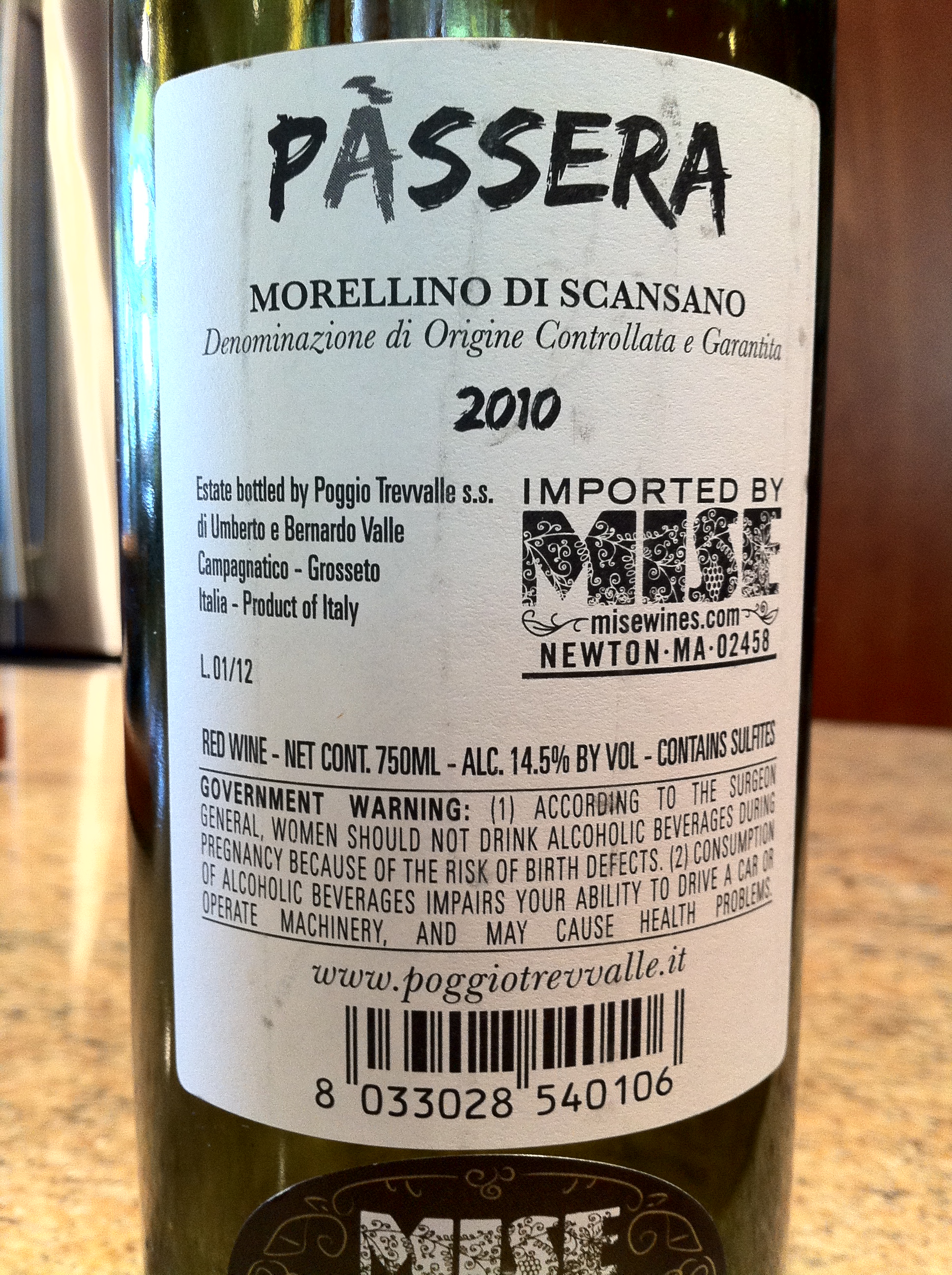 While the content is almost all vegetables, the dish packs a lot of flavor.  The long cooking plus the natural sweetness of the corn water concentrates those flavors, so it was well-accompanied by a medium-bodied red wine from Tuscany.  My choice was a 2010 Morellino di Scansano — “Passera” — made from Sangiovese grapes.  It was a superb match and only $16 retail – before my 10% discount.