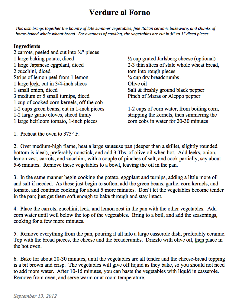 Another variation to consider would be to serve the cooked vegetables on top of pasta, rice, farro, couscous, or other grains.  The key to success is high-quality produce, combined with proper braising and baking technique — mostly trial and error — but also a process that seems quite forgiving, which is why mine came out fine and yours probably will too.  Buon appetito.