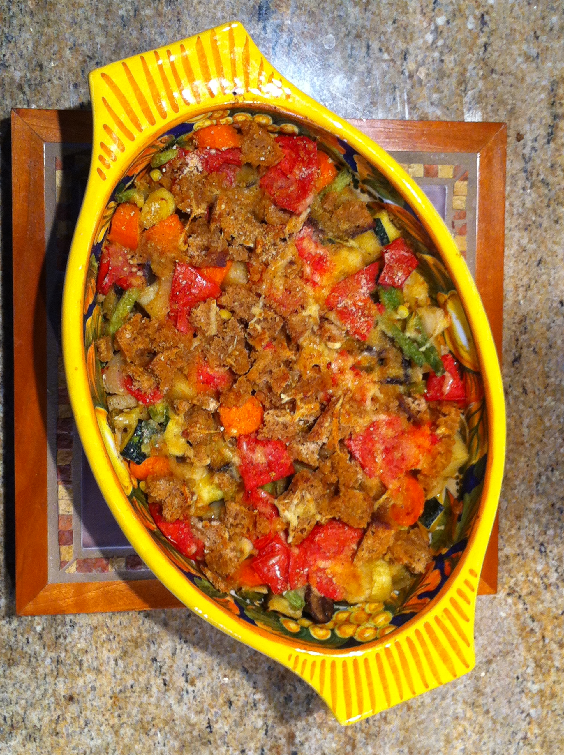 I do miss cheese sometimes.  That is why, last night as I was fantasizing about making some sort of a vegetable casserole for dinner, I held a brief discussion with the guardian of my health (my alter ego).  We agreed that the following recipe would be as salubrious as it would be healthy — even with a small amount of cheese (thus, mostly vegan).