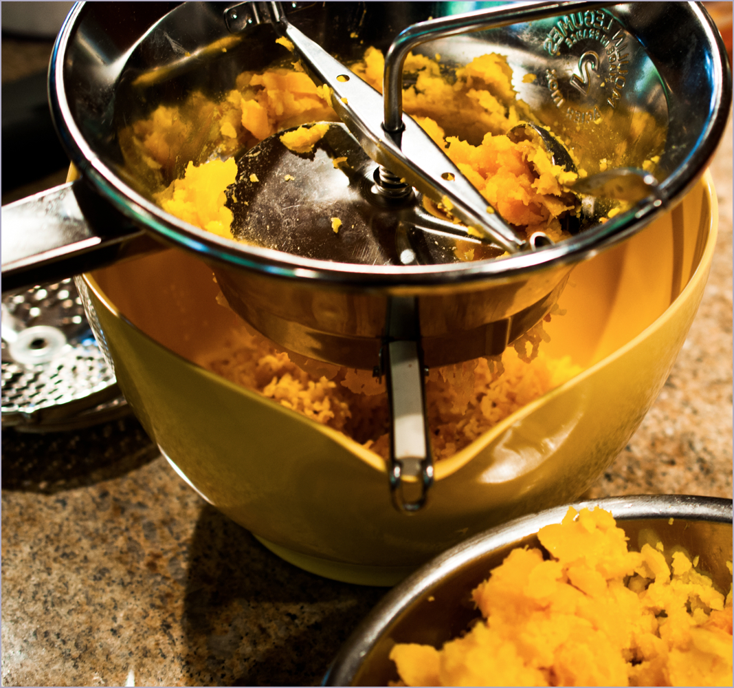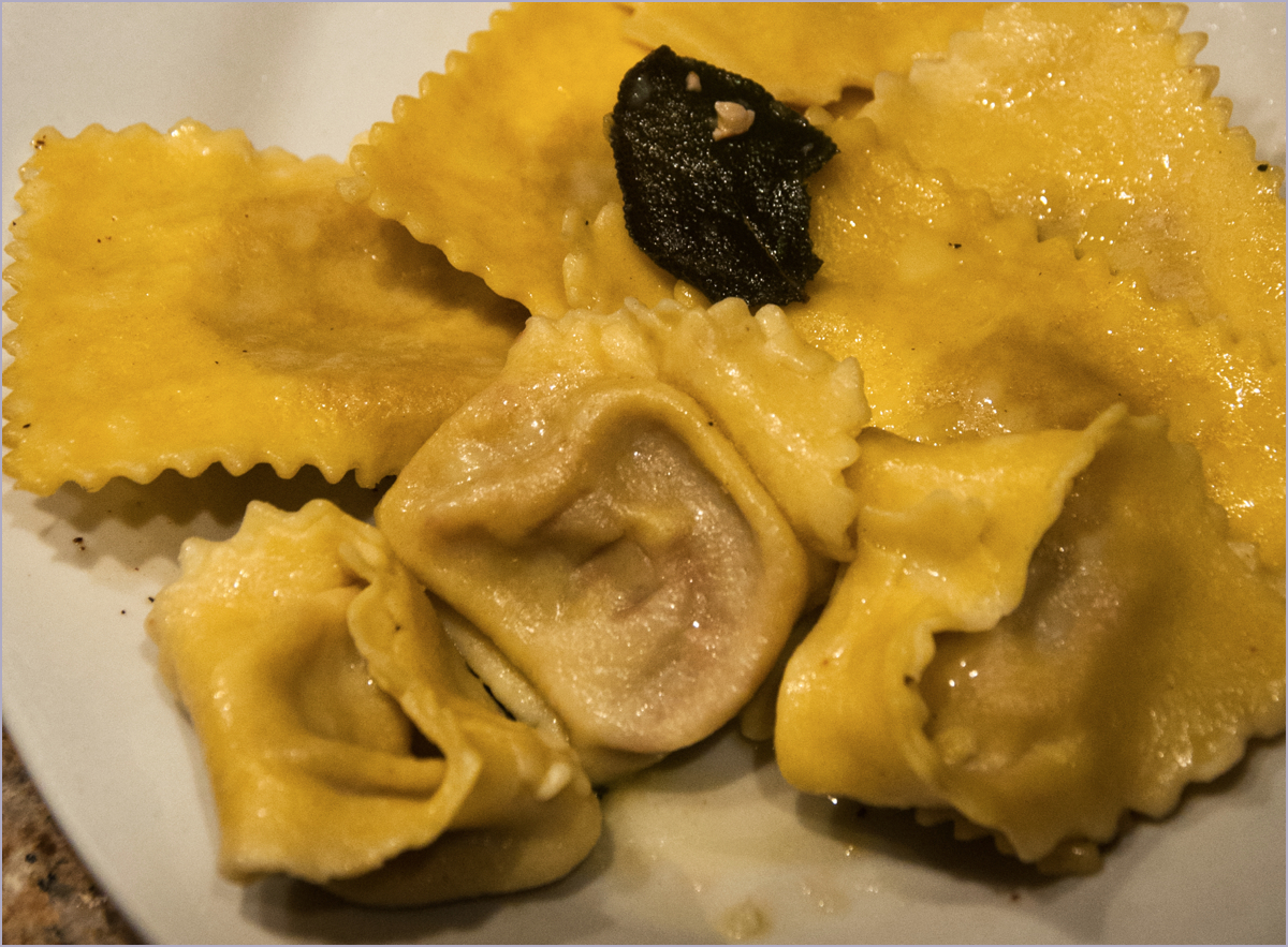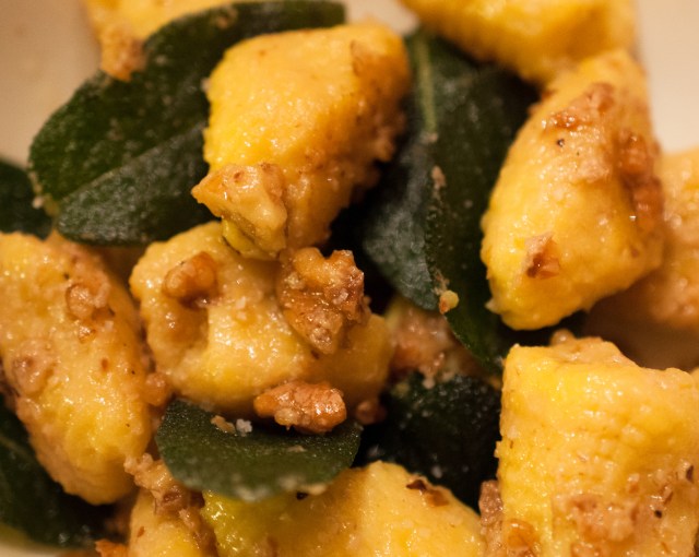 Remember the roasted butternut squash last week, for the Cappellacci di Zucca? Well, I had some puree left, and I found a recipe for gnocchi in La Cucina di Lidia, so I decided to make some tonight. Note: I used the plain pureed squash, without the walnuts and corn butter that I had added to the filling for cappellacci. Making gnocchi is pretty easy, and it’s fun, especially if you happen to be in possession of a gnocchi board (cool, but not necessary at all). The technique is perfectly explained on this website, which includes a superb video clip.
