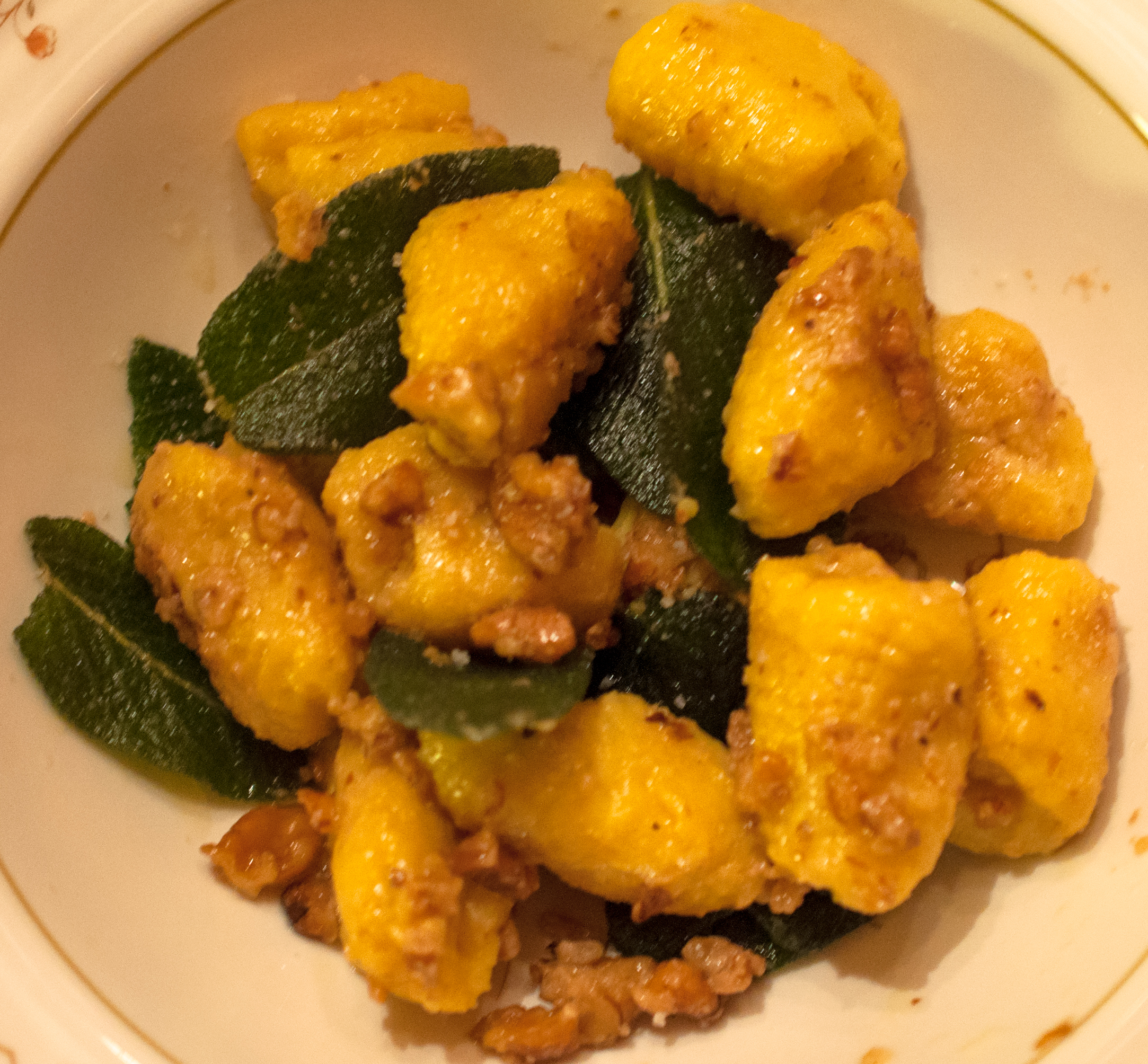 Many sauce alternatives are available. My choice for tonight was a riff on the classical butter-and-sage-leaf sauce. First, I picked a bunch of fresh sage leaves from my plant outside. Then I fried the leaves in about 1/3 cup of olive oil (still vegan this weekend), and removed them to a plate when crisp. I chopped 1/4 cup of organic walnuts and warmed them in the oil on low flame. As the gnocchi rose to the top of the pot, I scooped them out with a wire strainer and dropped them in the sauce. Added a little of the pasta water to the sauce (less than 1/4 cup) and boiled it down a bit. Serve in a pasta bowl: