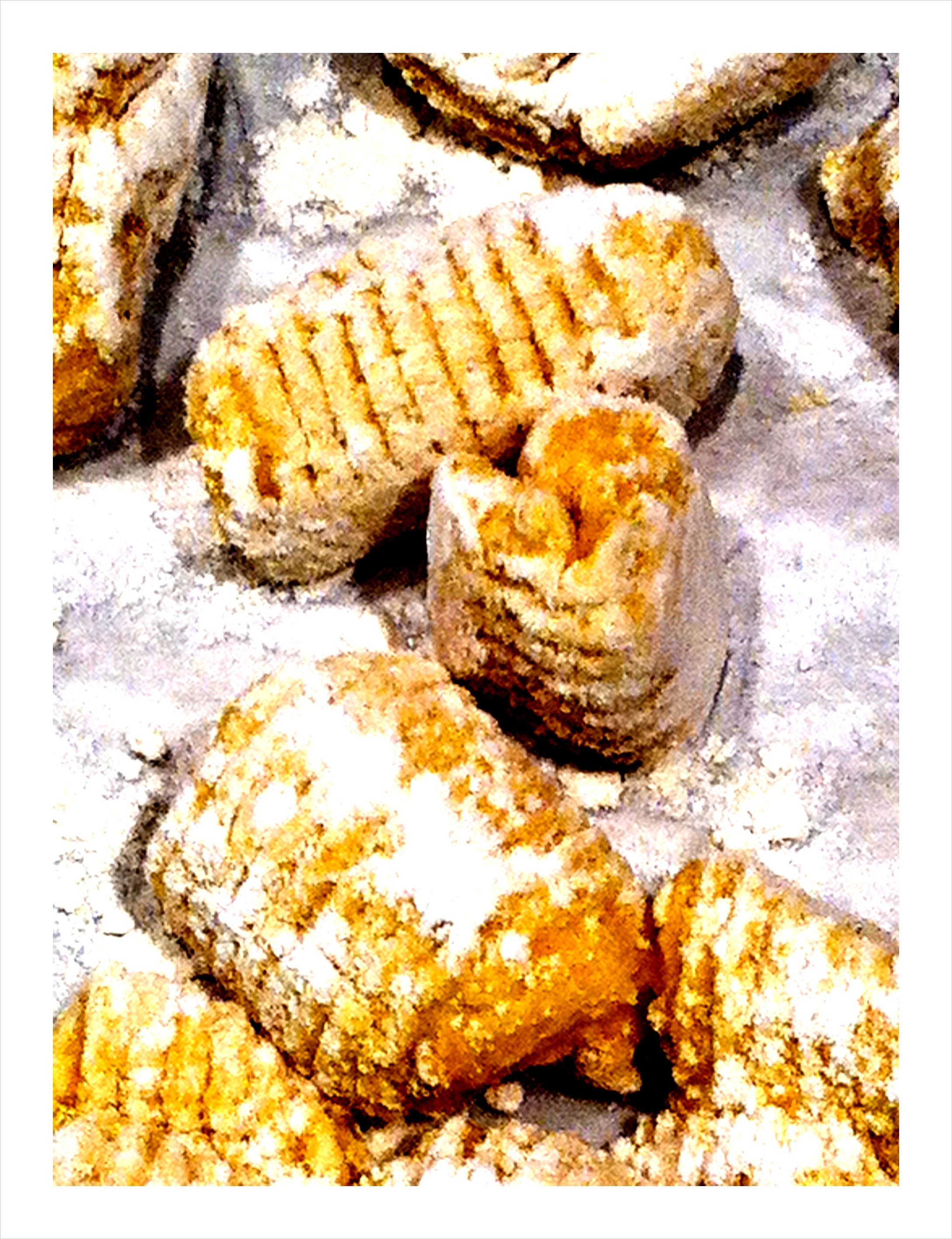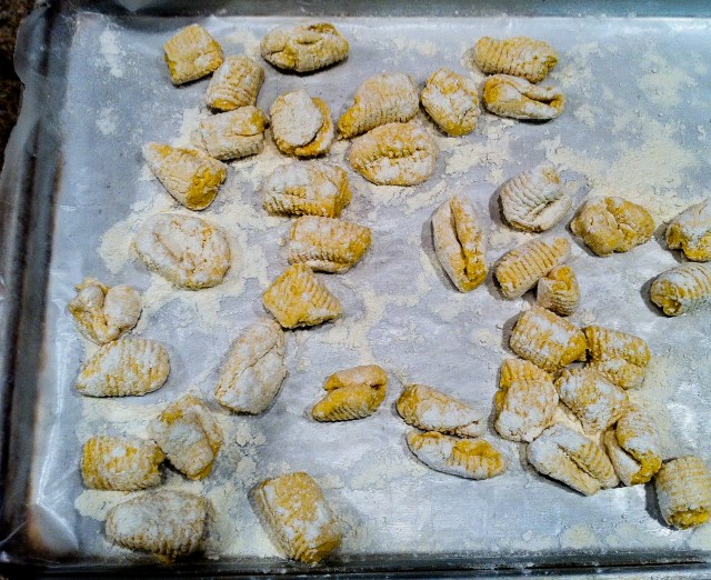 After cooking the gnocchi we ate that night (previous post), I froze an equal amount that the dough made, to save for next time. Here is what they look like after coming off the gnocchi board. They freeze well, and cook quickly, too.