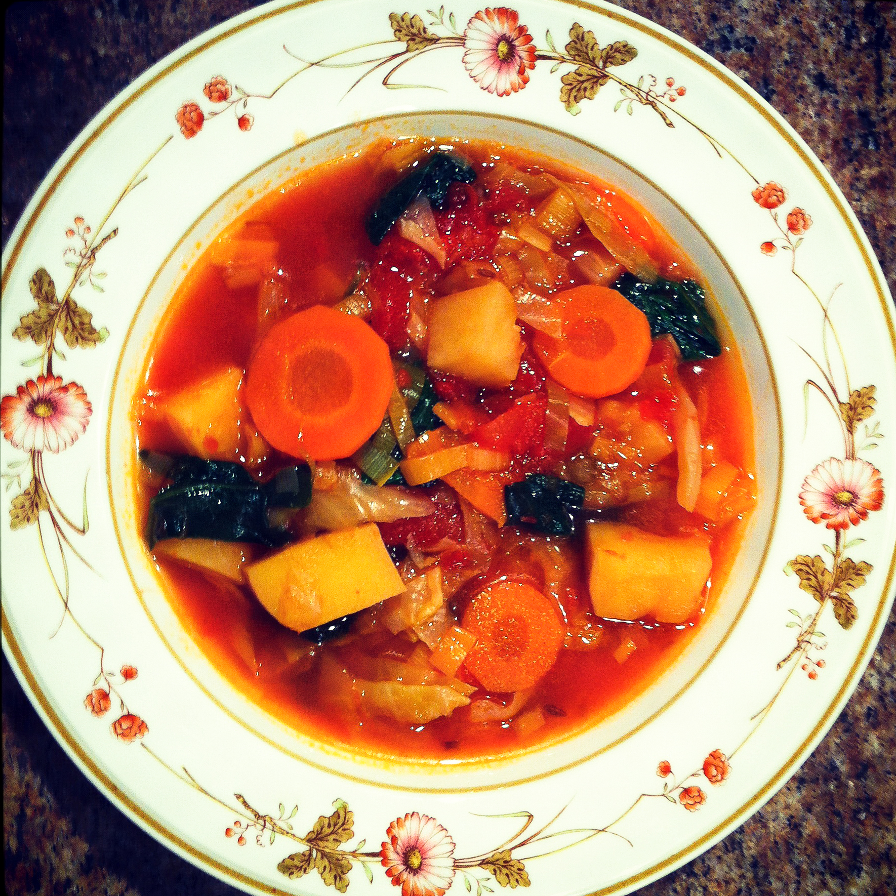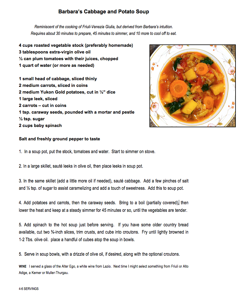 17,287. That’s how many days Barbara and I have been married, so far. There are many good reasons, but one is that she is a talented, creative and intuitive cook. Tonight’s example is a Cabbage and Potato Soup that she made up for dinner, with what was on hand in the kitchen. Nicely done, Dear.