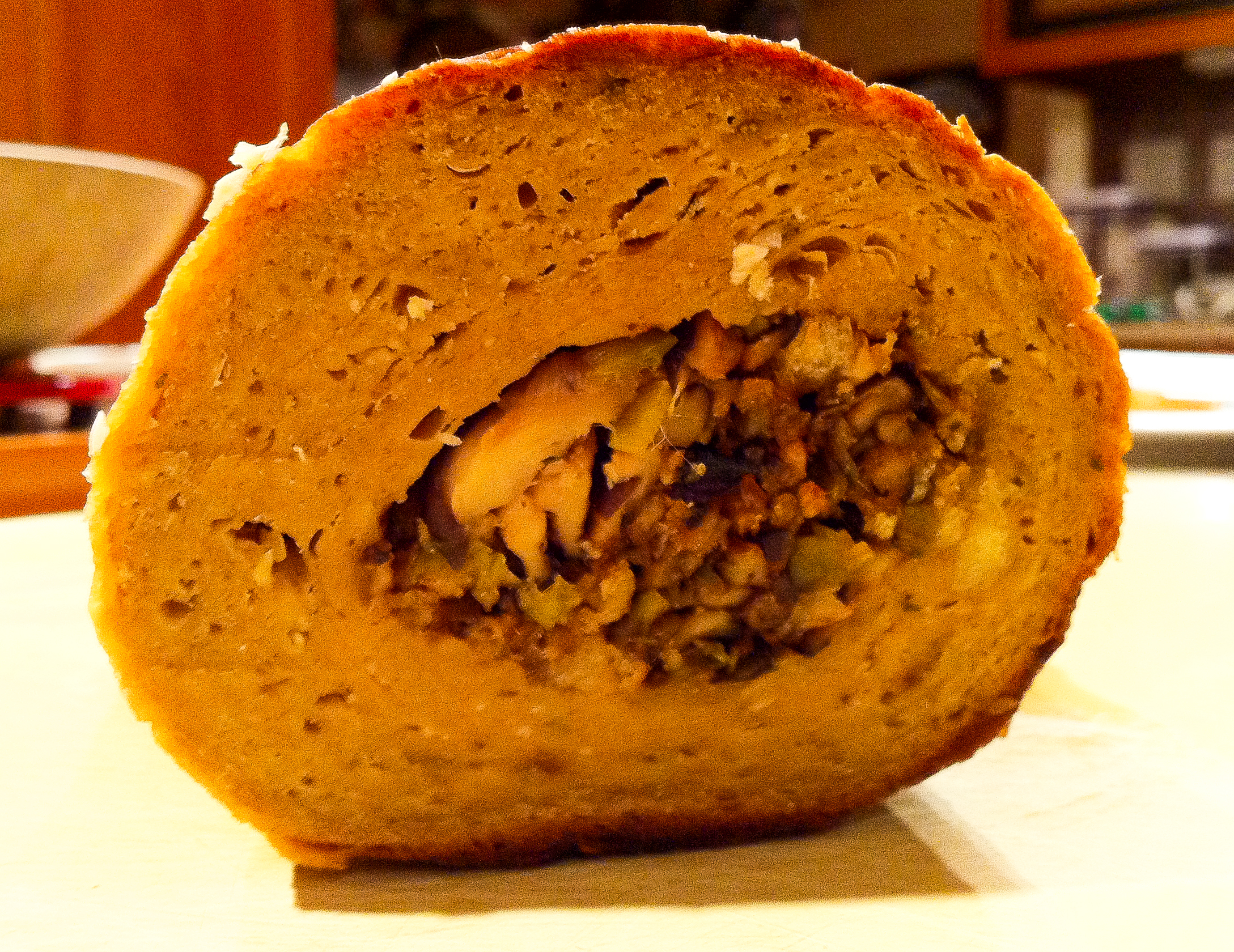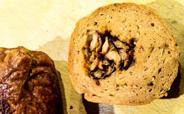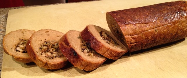 We made our own seitan for the first time a couple of weeks ago, with a recipe for spicy Italian vegetarian sausages, and they came out quite good. However, in my years as an omnivore, I made real Italian pork sausages (luganega), duck sausages, lamb sausages, lobster sausages and fish sausages — you get the idea. With my memory of those tastes and textures still accessible, it’s probably not surprising that we still prefer vegan foods for themselves, and try to avoid dishes which resemble vegan substitutes for meat and dairy. Nonetheless, I do keep experimenting, and last night I tried out Isa Chandra Moskowitz’s Seitan Roast Stuffed with Shiitakes and Leeks. Here is the report.