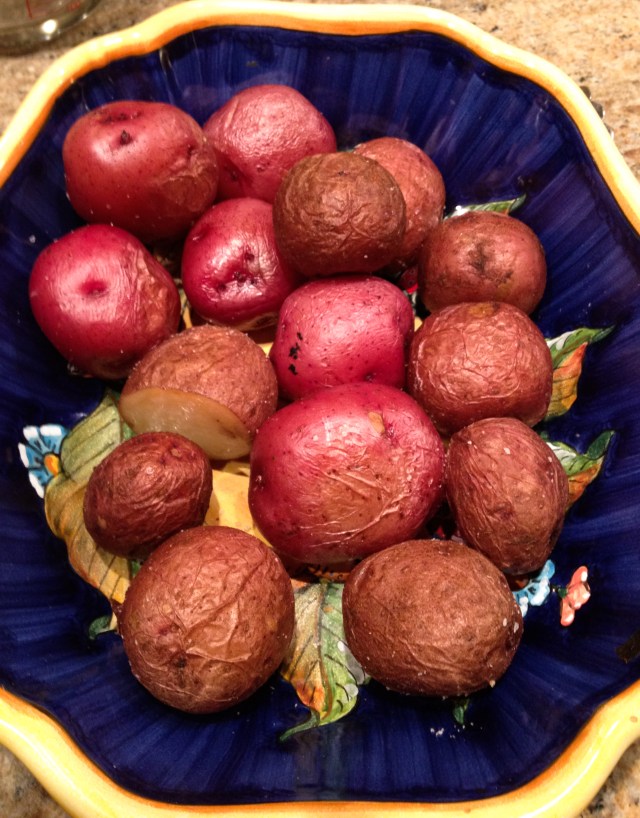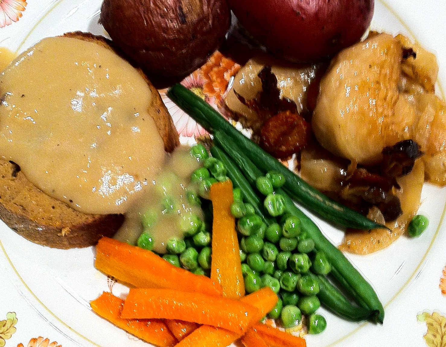 Anyway, we rolled up the leek-shiitake-breadcrumb-herb stuffing mixture inside the seitan, wrapped it all in sheets of aluminum foil, and baked it at 350° F for 90 minutes. While it was cooling, I oven-roasted small red potatoes on a bed of coarse salt (an amazing recipe, simple and absolutely delicious), sauteed separately carrots, peas and green beans, and then made my own vegan gravy to pour over the roast.