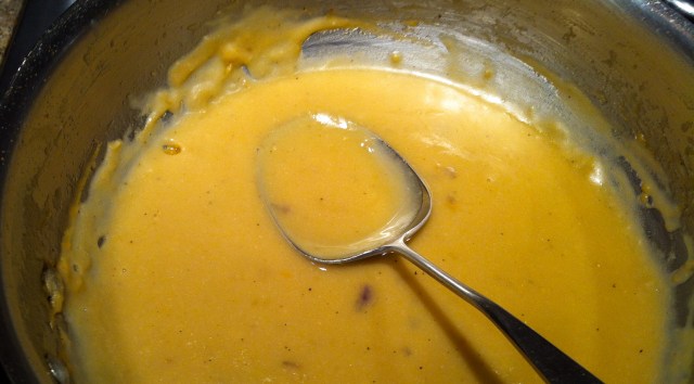 The gravy turned out to be interesting. Started by sautéing chopped onion and garlic in about 3 Tbs. of olive oil. Next, I added almost 1/4 cup of flour and 3 Tbs. nutritional yeast. This seized up in the pan so I had to add 2 Tbs. more of oil, then cooked slowly until the flour was golden. At that point I added hot homemade vegetable stock, whisking it in to get the consistency saucy enough. I was surprised that it tasted good and remained stable, so it could be spooned over the seitan slices on the plate. The only other addition was to add some reheated braised cabbage to my plate (Barbara and Johnny passed on that delectable from Molly Stevens’ All About Braising book.)