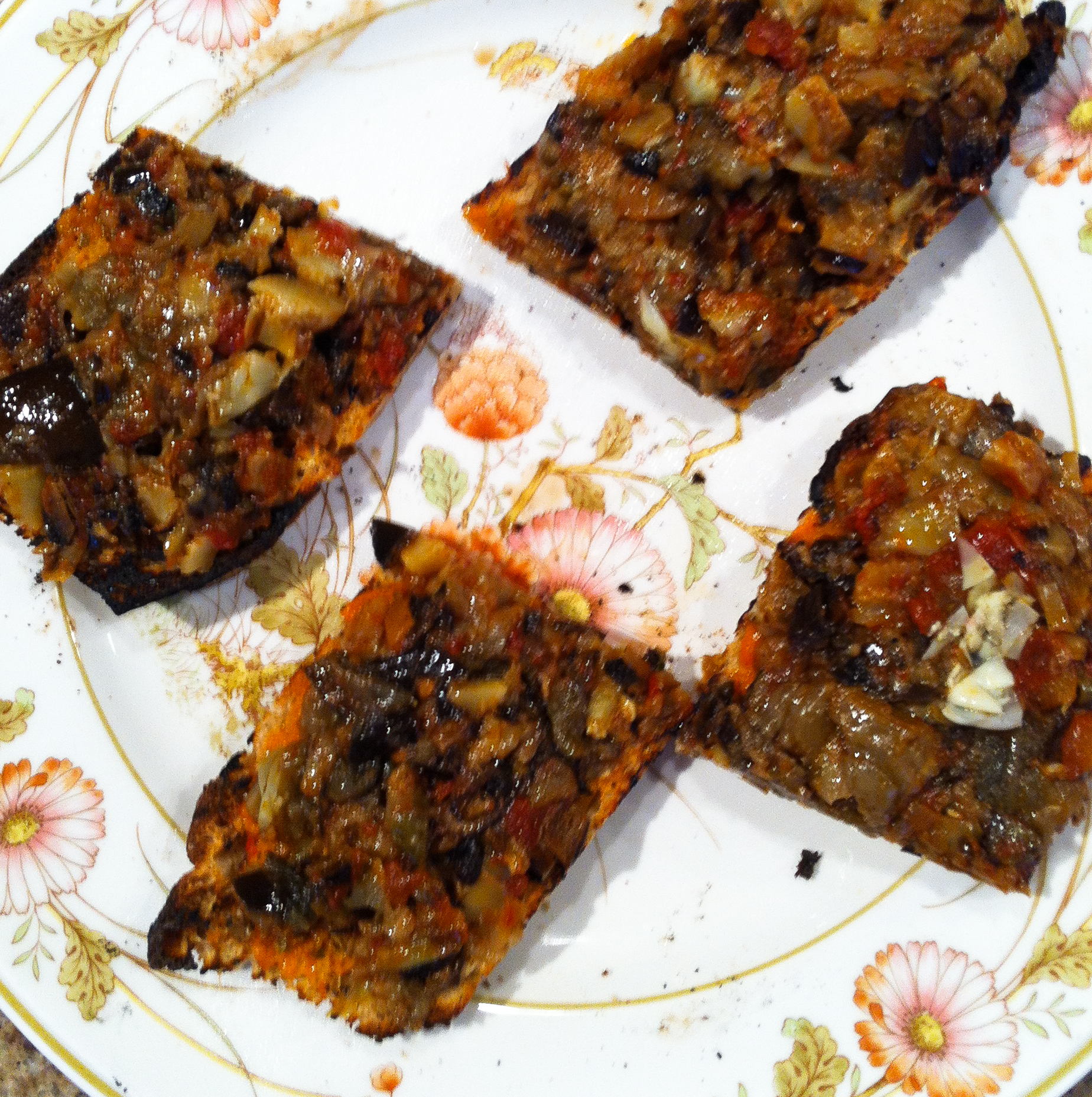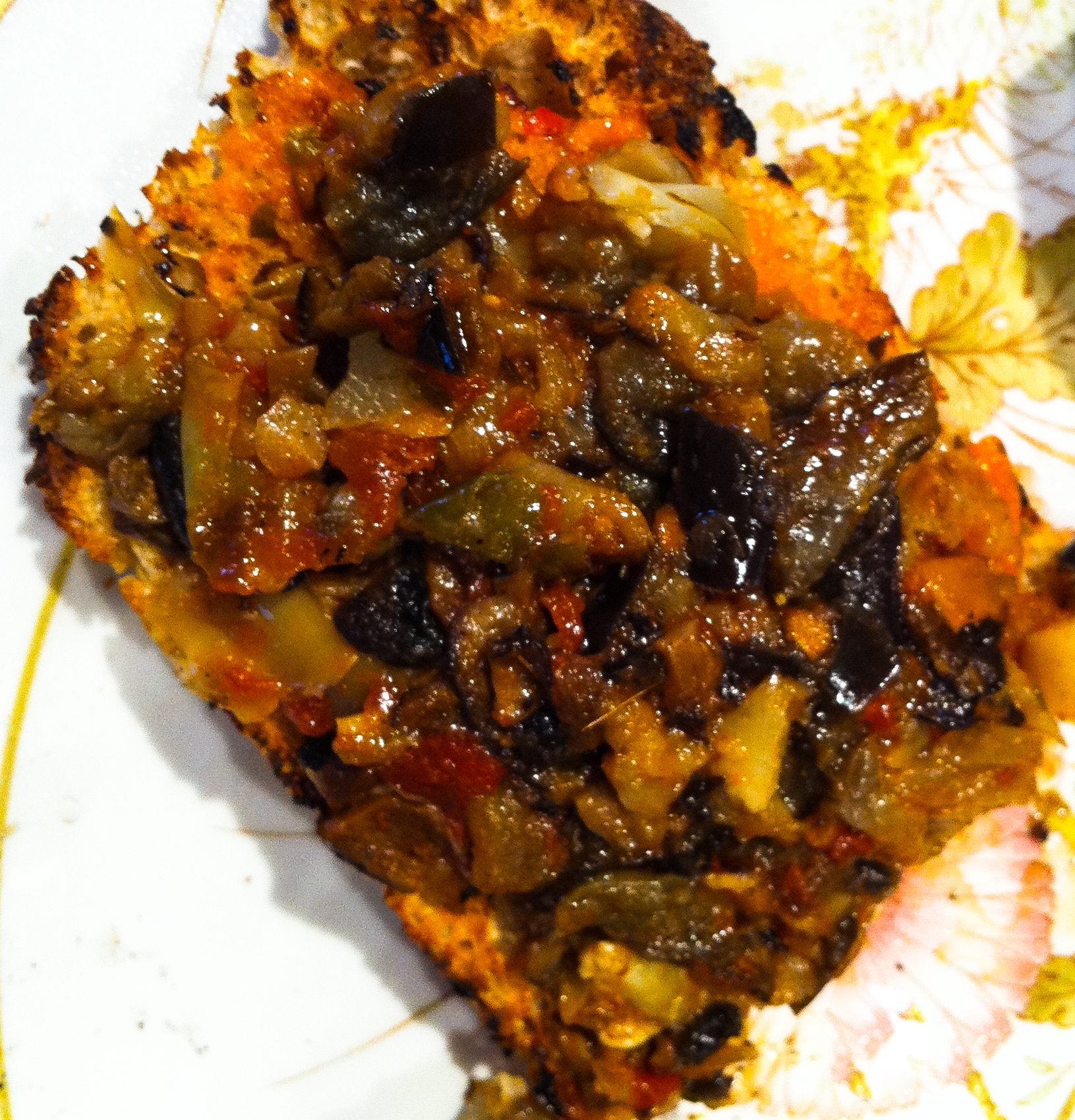 First, I coarsely chopped the vegetables in the ragout, and then spruced them up with some salted capers which were marinated overnight in olive oil. Then I grilled some thick slices of a multigrain bread I made recently (whole wheat, semolina flour, einkorn, rye and white bread flour). Rubbed fresh garlic on the toasted bread. Added a layer of Cream of Peppers and Eggplant (purchased at Di Palo in NY). Layered the ragout on top. Served with a wine I found at one of my wine suppliers last week, a 2009 Vid Sur, made in the Canary Islands from Tinto Negramoll grapes, imported by Jose Pastor. Benissimo.