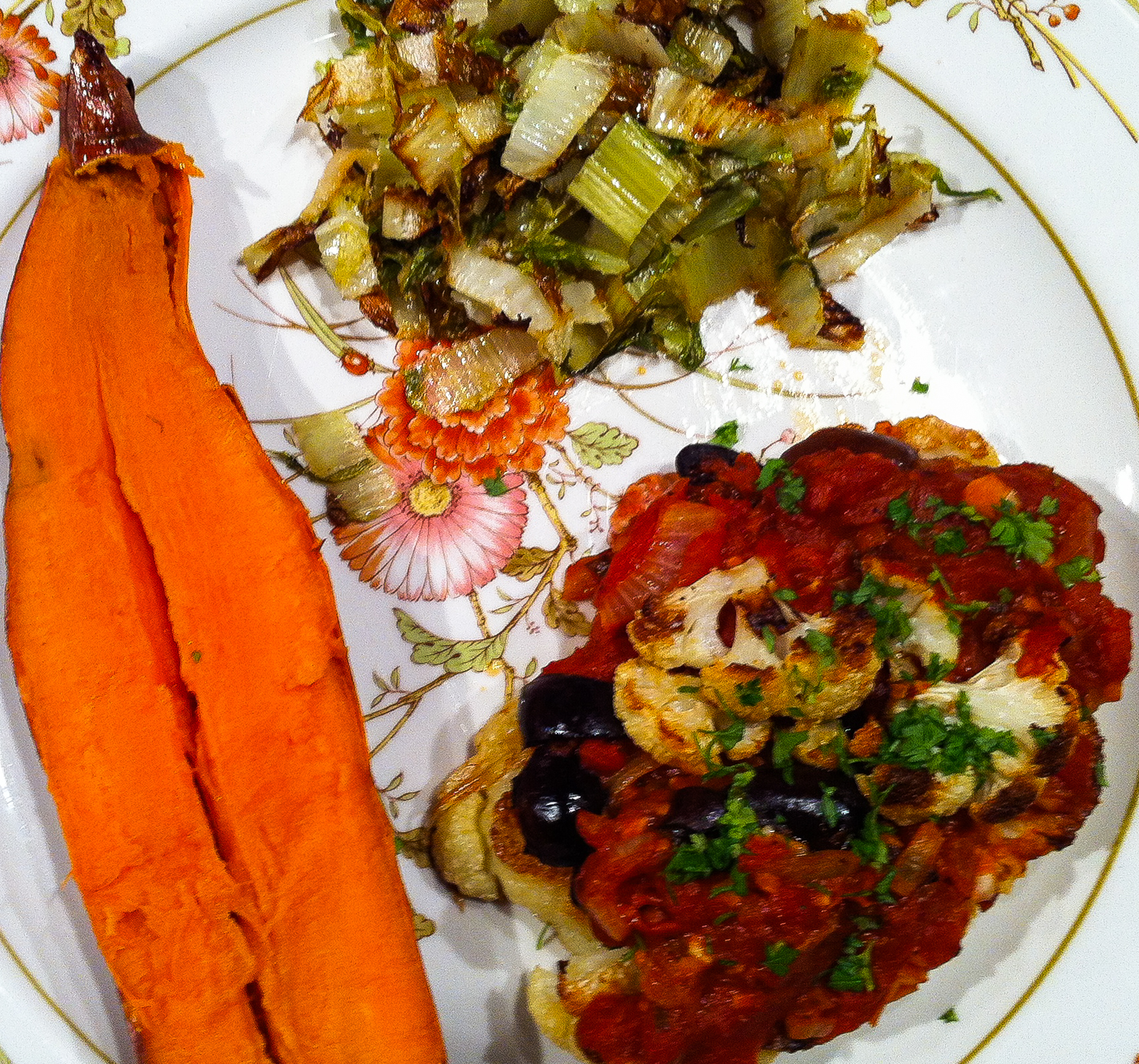 After placing two sweet potatoes (or garnet yams) in a roasting pan, she put them in an oven preheated to 425° F. She cut and roasted in the same oven 1-inch thick steaks cut from a fine head of cauliflower. Separately, she sauteed onions, garlic and a can of Italian tomatoes in olives oil, then added some pitted, coarsely chopped Kalamata olives. Next step was to place the sauce on the reasonably tender steaks and roast that until the flavors concentrate. Top with chopped chervil or Italian parsley.