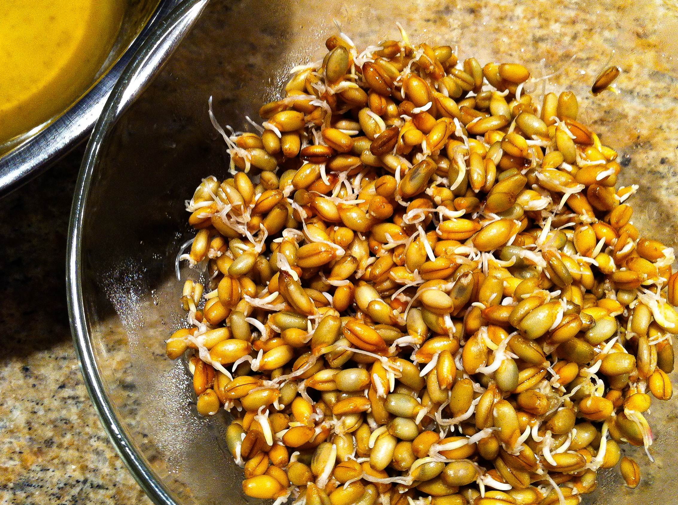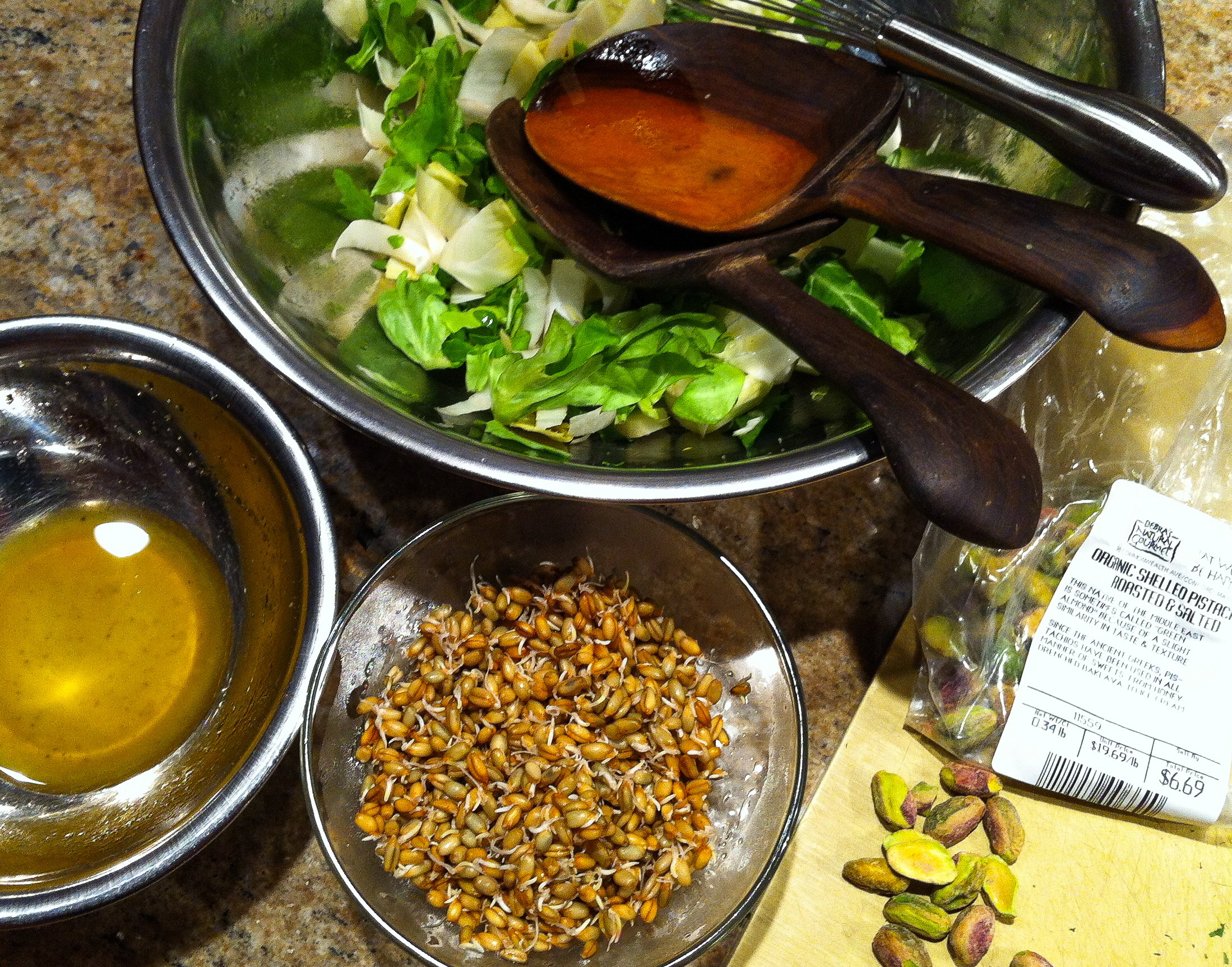 Excellent, but not quite done. I had an appetite for salad as well, so I cut up a single Belgian endive, added some shredded lettuce and washed young organic arugula leaves, and then finished it with a vinaigrette (salt, pepper, Spanish sherry vinegar, Puglian olive oil and a few drops of cool water) and topped with shelled organic pistachios and my miracle ingredient of the night — sprouted rye berries.