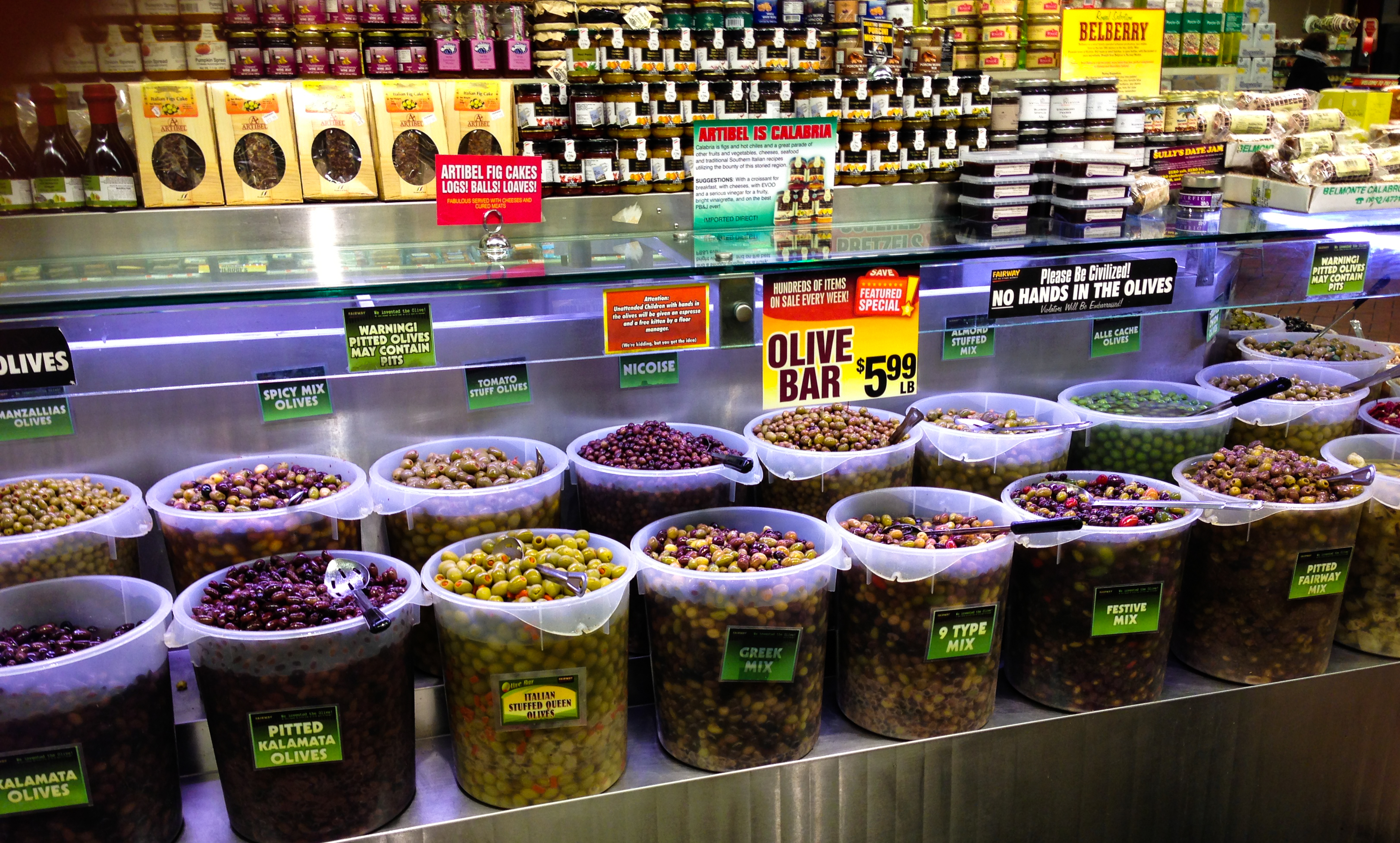 Next stop was the olive bar, a stunning collection with variety and value ($5.99/lb.). I selected several different ones happily.