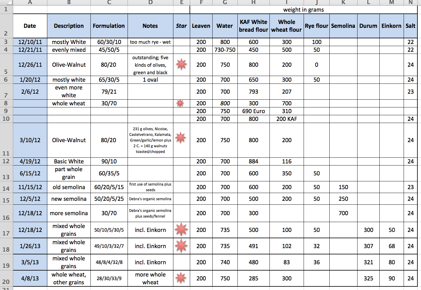I also raised the water content slightly, to 75% hydration.  Below is the table of my various mixtures over the past 17 attempts.