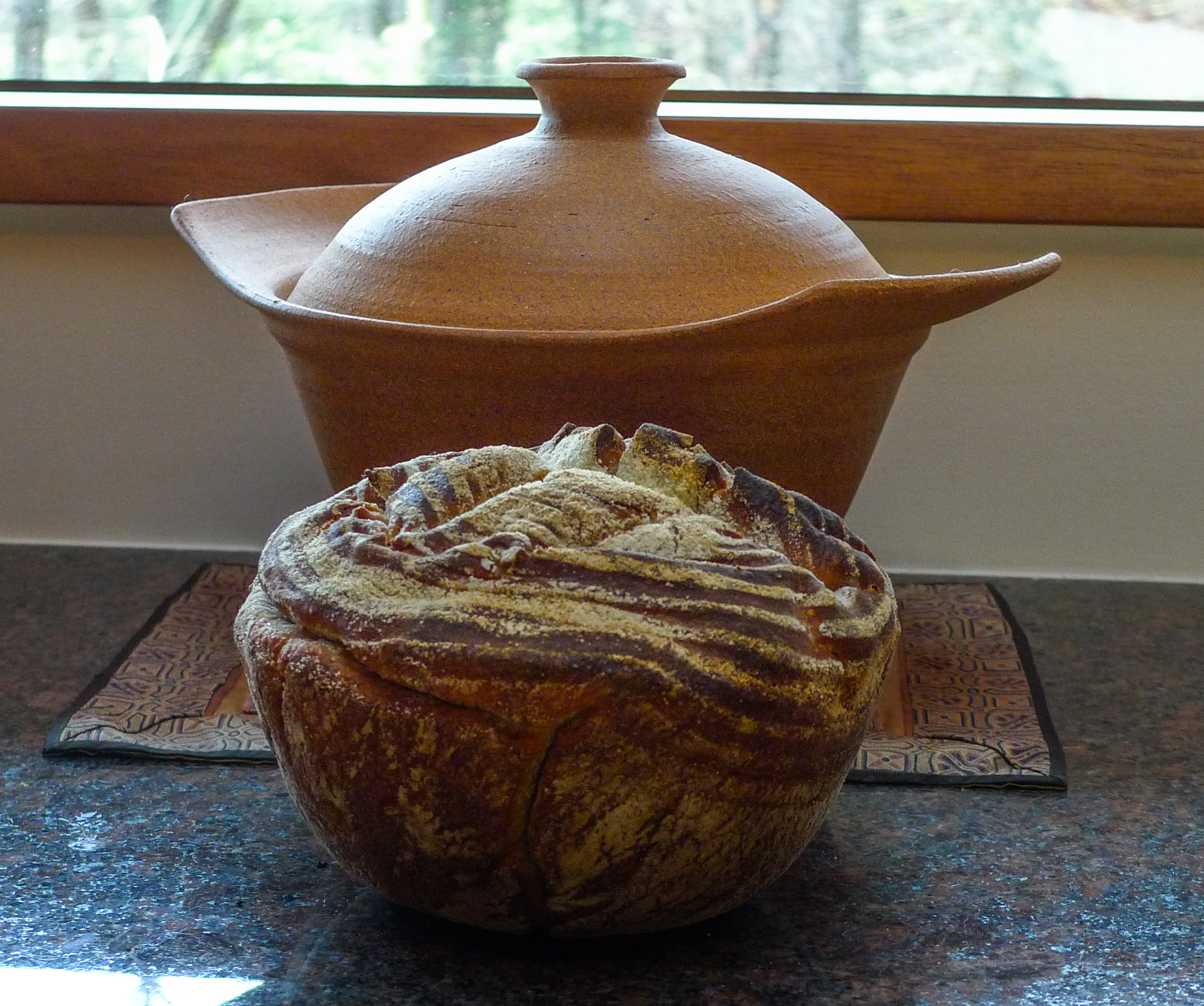 I’ve been making Tartine breads for a couple of years now, and the ones I like best contain large amounts of flour I grind myself from different whole grains.  This week I had another success in formulation, while inaugurating a marvelous new clay bread pot.