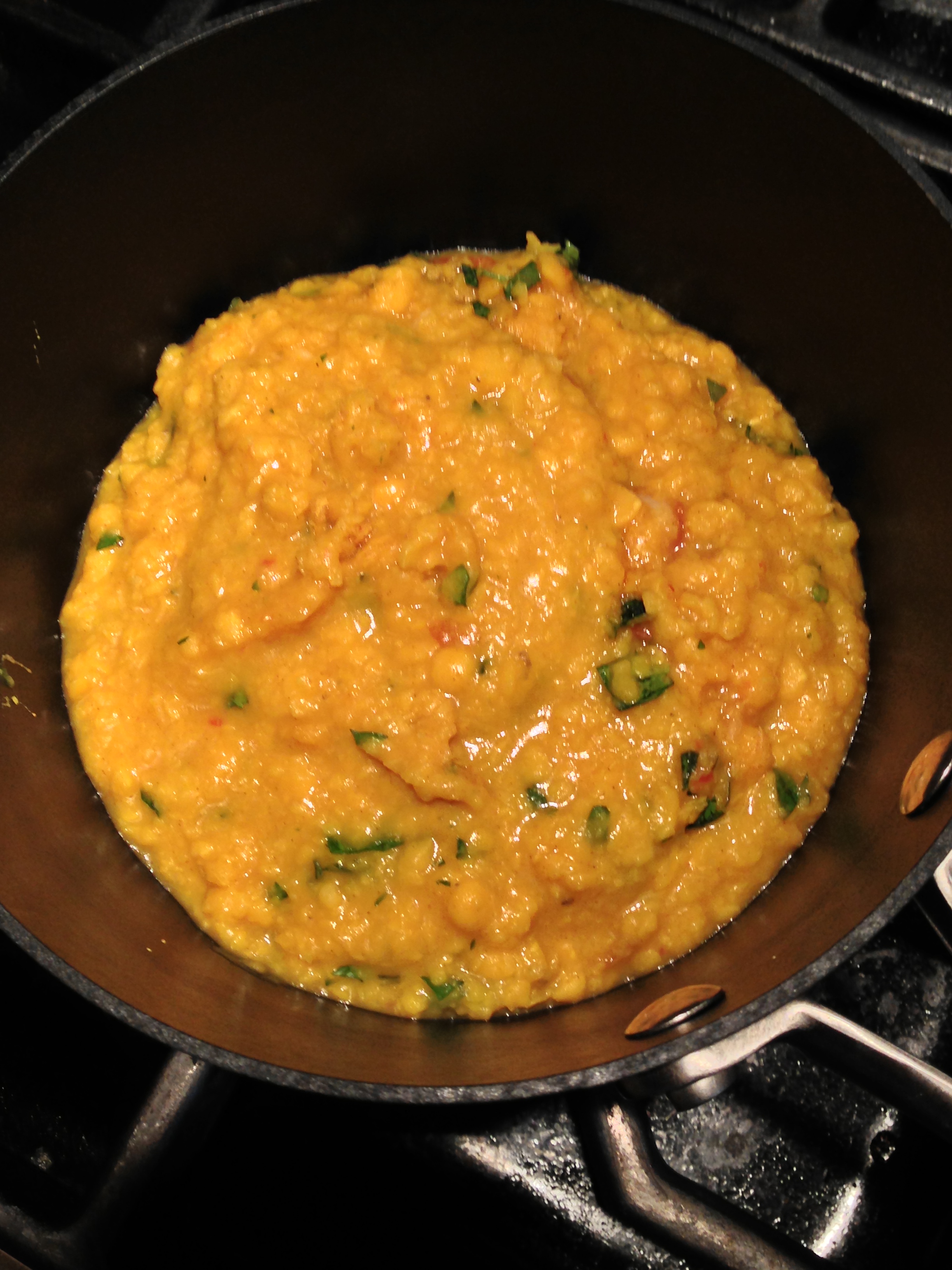 Not being in possession of a mathani (yet) to semi-puree the legume, I used a potato masher for similar results, and it seemed to work fine. After two satisfying bowls for lunch, accompanied by a pan-toasted whole wheat flatbread and a glass of St. Joseph blanc (100% Rousanne — smelling of peaches and apricots), I was very content. And well-informed on the glories of Chana Dal.