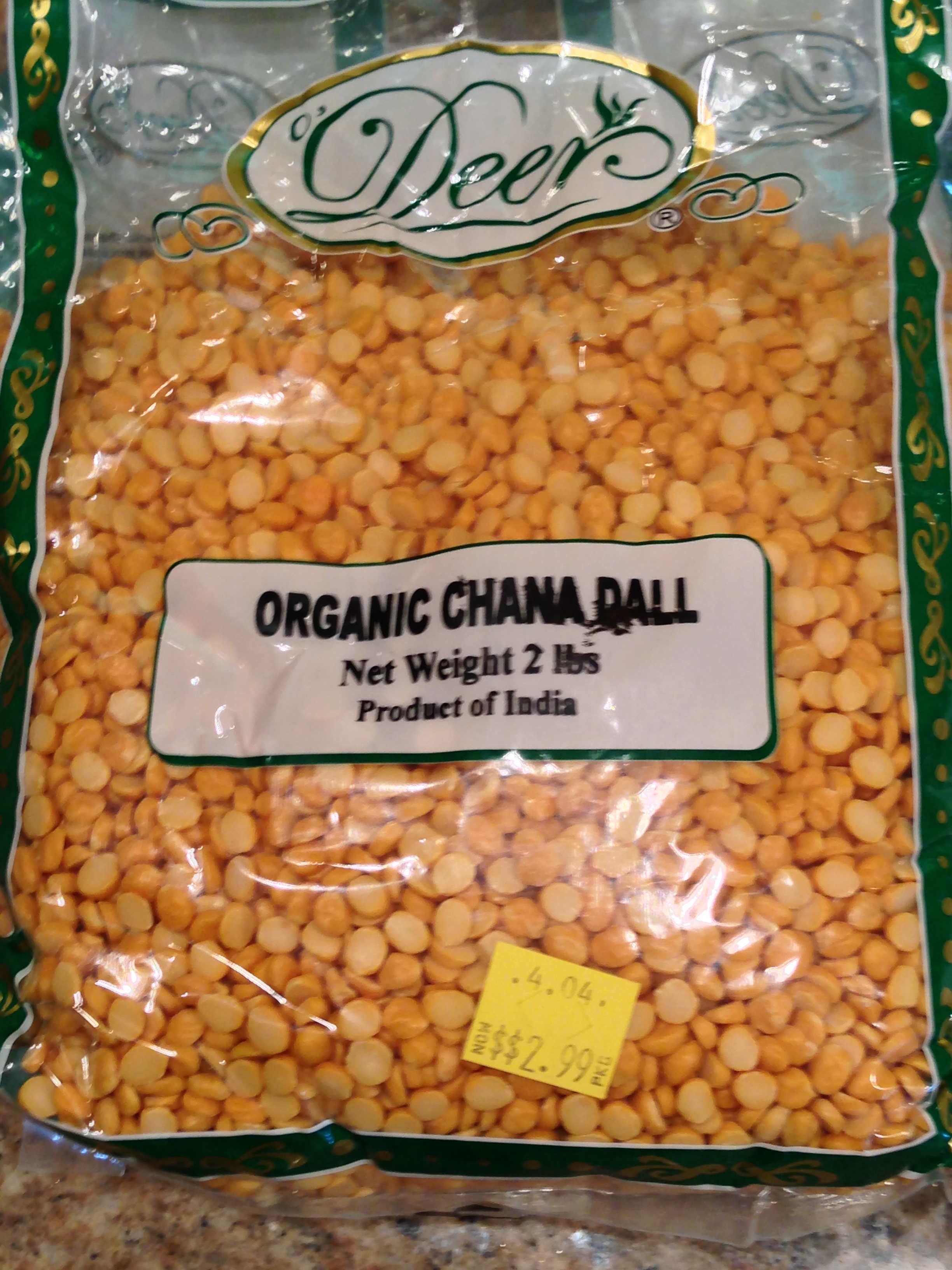 Serendipity works in strange and circuitous ways. A few days ago I was out doing errands and was getting prepared to make an eggplant-chickpea curry from an Isa Chandra Moskowitz cookbook that I like. En route to the Trader Joe’s for organic OJ, I was passing my network chiropractor’s office, so I stopped in to get a couple of supplements. Since they are next door to an Indian grocery market, I went there to get a bunch of fresh cilantro. Browsing the shelves as I always do, I bought some red lentils (a current favorite of mine) and a can of Indian chickpeas (to compare to the Trader Joe’s organic ones I also intended to get). Further down the legume shelf — and fascinated with the variety there — I came across a package of dried organic Chana Dal. I asked they owner about it, and he told me they were split chickpeas and very good, so for $2.99 I decided to try the 2 lb. package. Here is what I discovered.