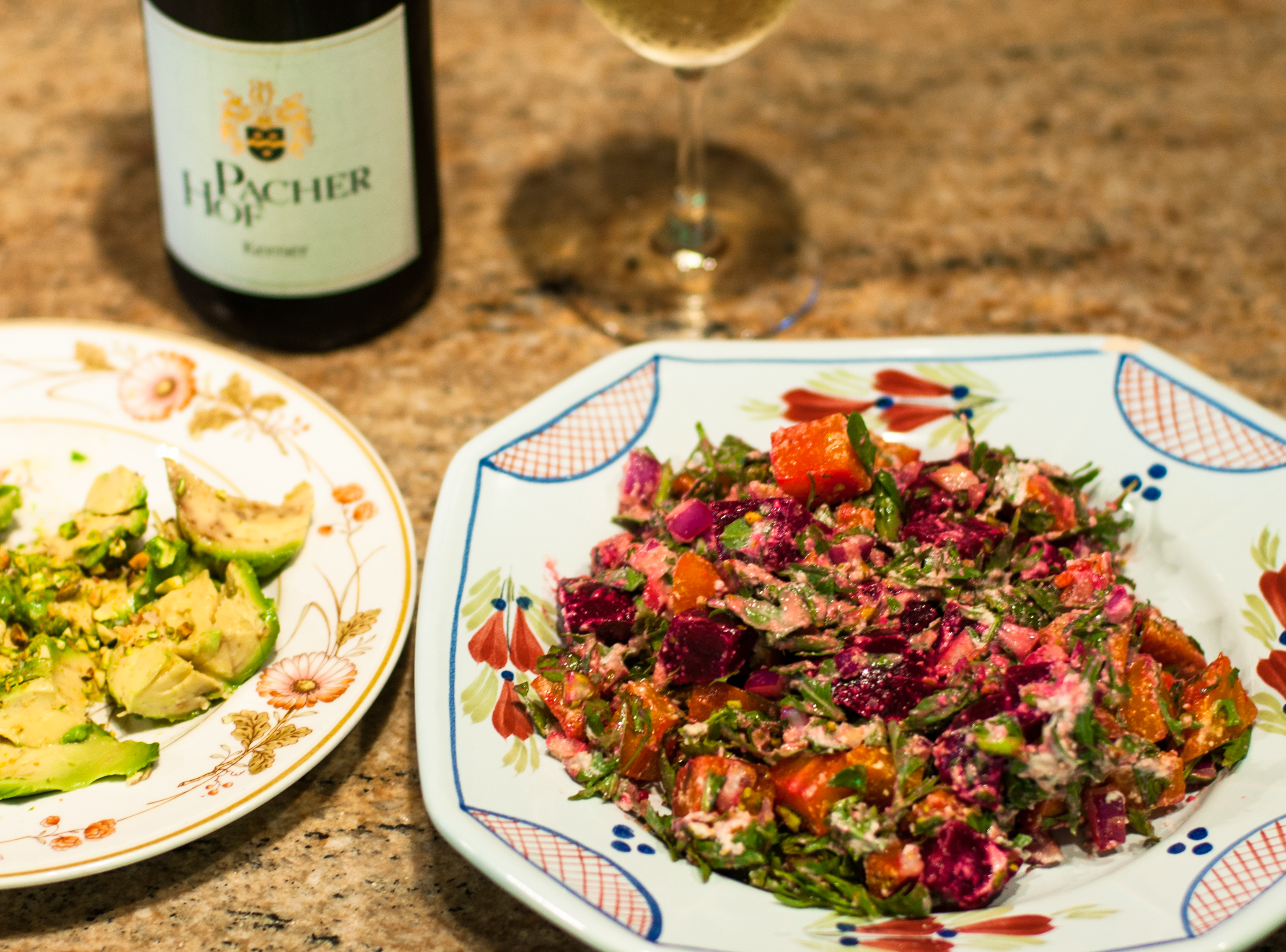 I’m still benefitting from the farmer’s market bounty of Saturday. Today’s lunch was a Beet Salad, made of roasted golden and red beets, chopped red onion, fresh arugula from the garden, some chopped young mustard greens, chunks of roasted red Greek peppers, and several dollops of my cashew cheese, topped with chopped pistachios.