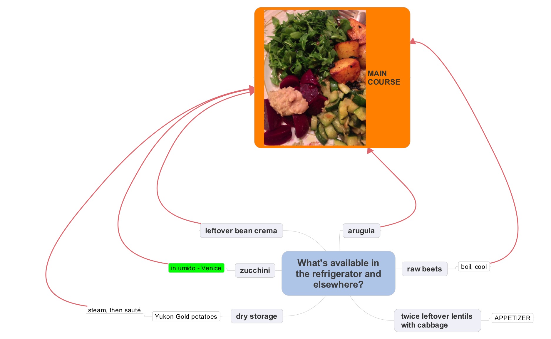 I usually start to prepare a meal with a question: “What is available?” That leads to several attractive ingredients, each of which I try to prepare in a pleasing way, and then with an eye to integration, I put it all together into a supper. I even did a flow chart/mind map for you with tonight’s meal as an example: