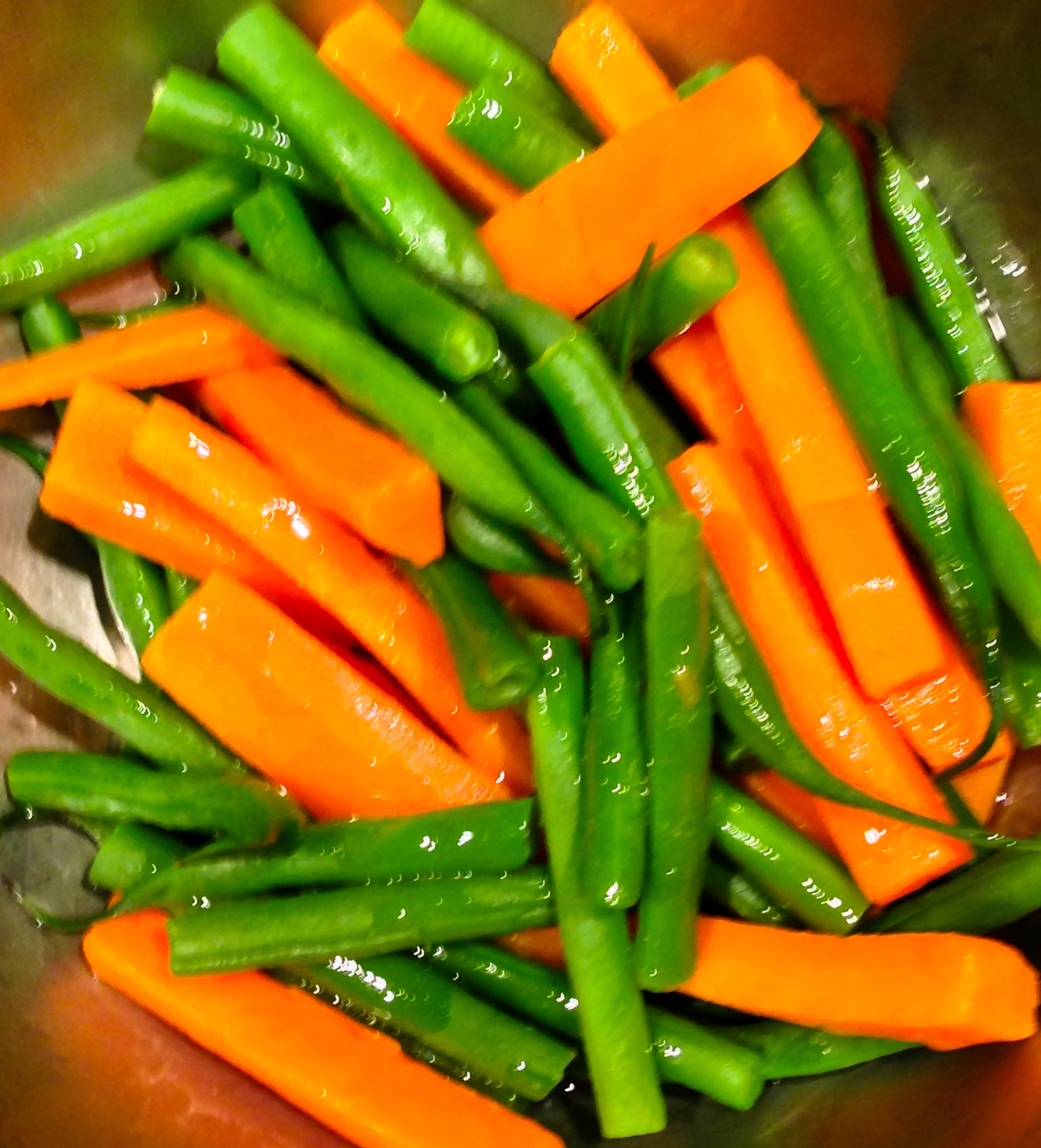 Nest step was a quick preparation and boiling of a handful of haricots verts and a piece of a large carrot, cut into batons. When tender, these were cooled and lightly coated with a lemon olive oil from Santa Barbara and a little sea salt. Simple, and delicious.
