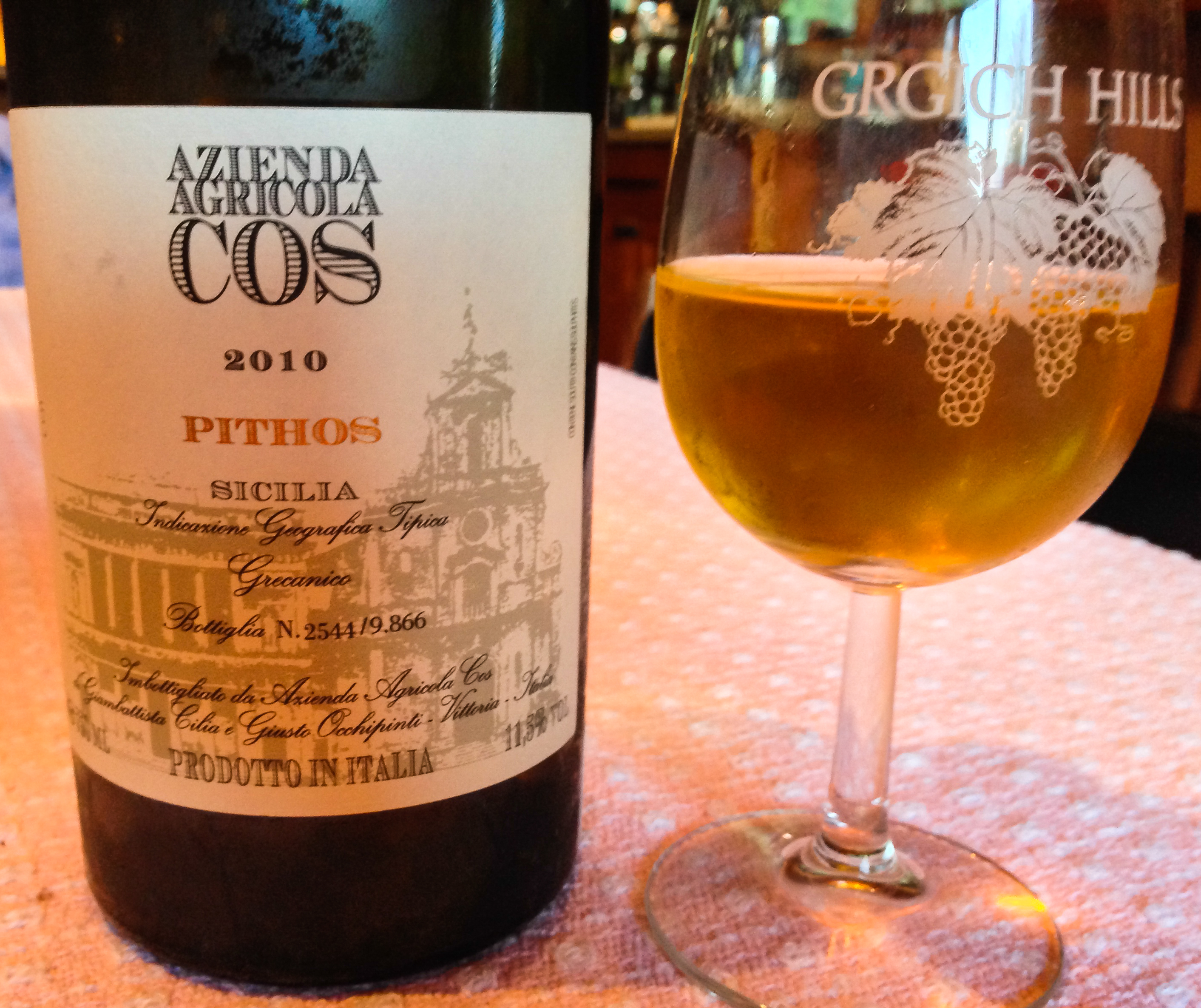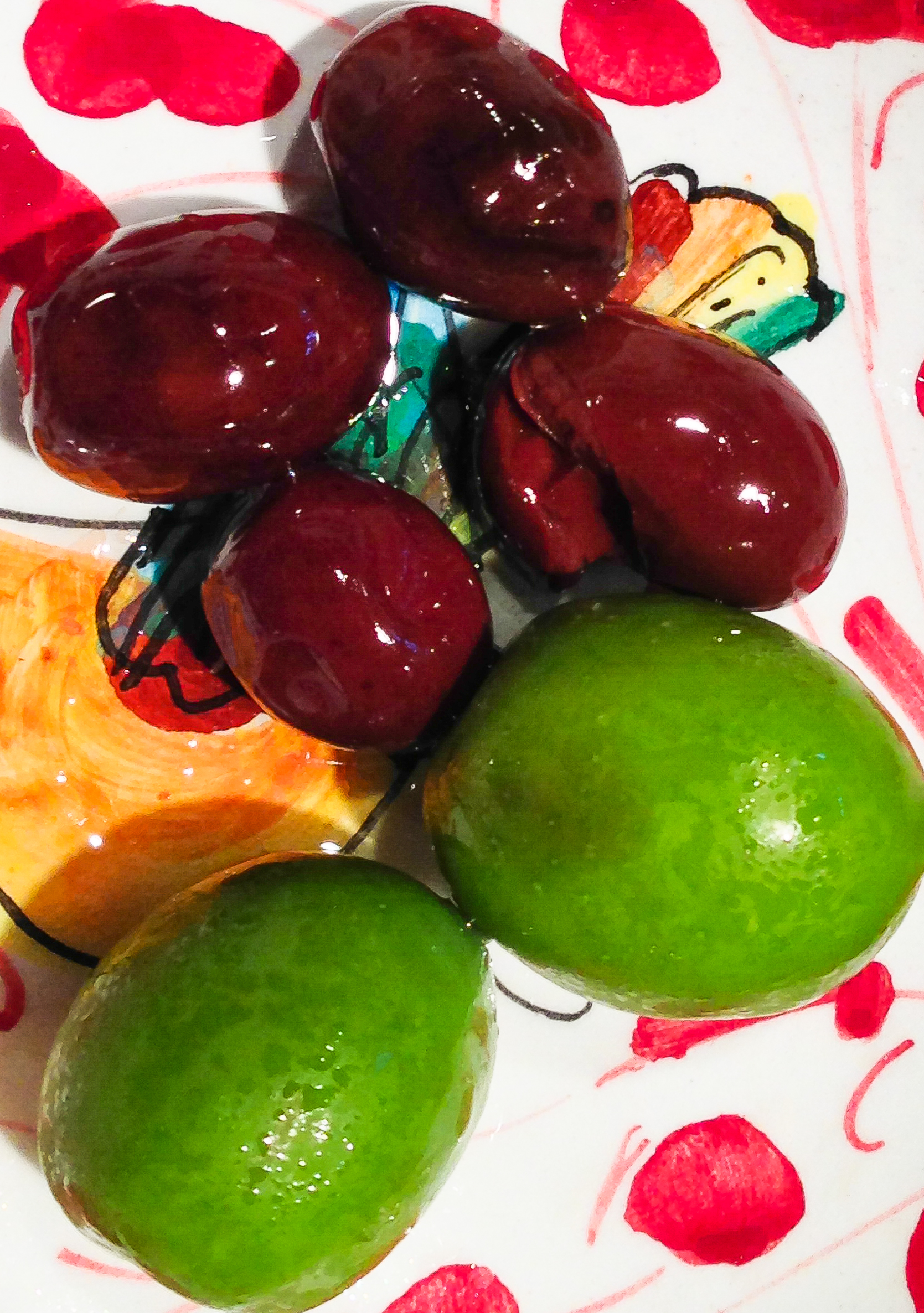 I temporized while deciding what to prepare, which means I munched on some of the many olives in the refrigerator (these below are Castelvetrano and a black Ligurian, probably Taggiasche) and finished up the white Sicilian Pithos wine while I considered the options.