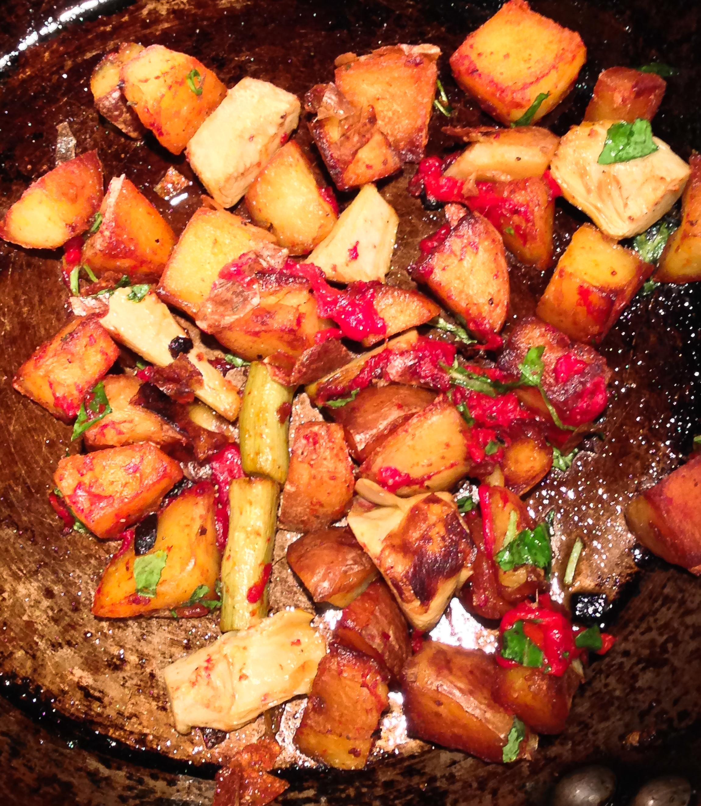 Several leftovers caught my eye as I searched the refrigerator: sautéed small Yukon Gold potatoes, Roman artichoke hearts in a jar, and roasted red bell peppers I had prepared last week. First, I cut the potatoes (already quartered) into smaller pieces (about 1/2″ dice) and fried them in olive oil in my heavy metal steel pan. After they started to get crispy on multiple edges, I cut up an artichoke heart and stem, and added that to the pan. When that looked a bit crispy, too, I scooped up about half a roasted red pepper, adding that to the sauté. The pepper was very tender (you would be too, if you were roasted, then sat in olive oil for a week), so it wrapped itself around some of the potato cubes, adding sweetness and texture. The result was reminiscent of some of the best Spanish Patatas Bravas, but different in a pleasing way.