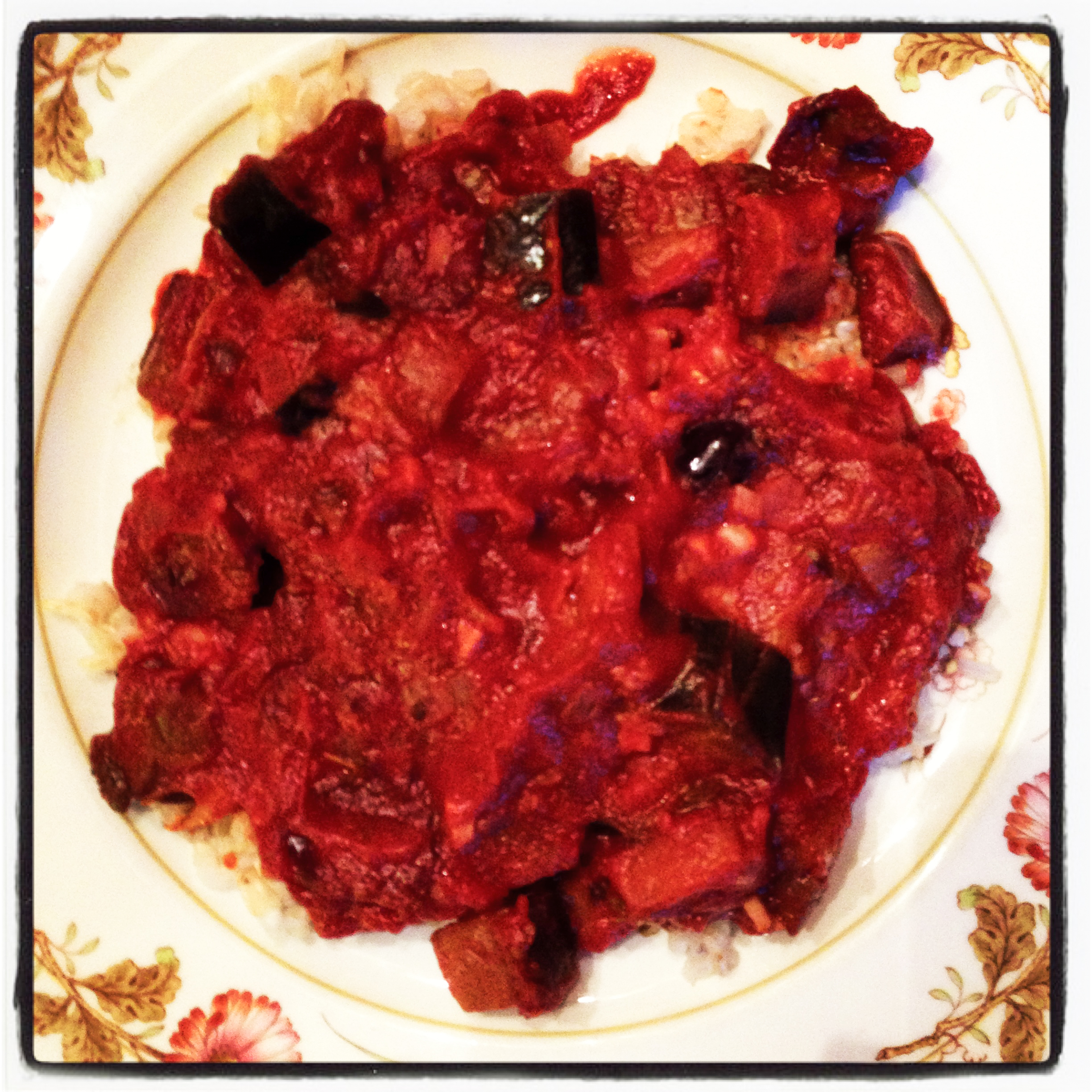 Yesterday, I was in the mood for meltingly-tender, slowly-cooked (but not in a slow cooker) vegetables, so I prepared two terrific dishes from recipes I came across recently. One was Roy Finamore’s Broccoli Cooked Forever recipe on Food52.com. The other was an Eggplant and Olive Stew from a food blog I follow, with the charming name of Easy Peasy Organic. I had a small quantity of each last night and was more than delighted, so tonight we built dinner around them, using the Eggplant-Olive Stew served on organic brown rice as the main dish, with a large side plate containing these vegetables: