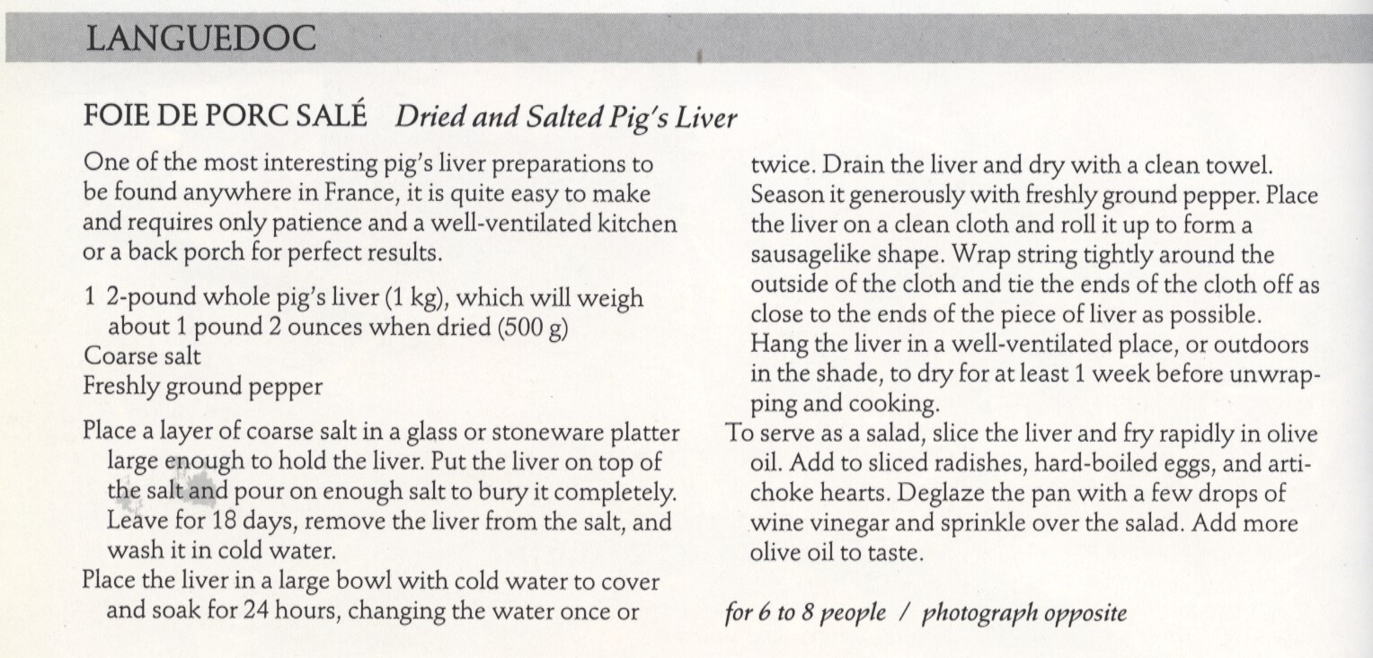 Then, since the book has so many beautiful, evocative photographs of food and the French countryside, I browsed a little longer. Now the the fun part: have you ever made a recipe that requires about 30 days to complete? Well, with fair warning to all of us vegans (this recipe is all about pig’s liver), I thought I would share it with you. The scary part is that there may have been a time in my distant past when I might actually have attempted to make this. For now, however, I am content to fantasize how it might taste, and what wine I would choose to accompany it. If any of you wish to rise to the challenge, be my guest. Please let me know how it turns out. It might not even be “ridiculous”. Buon appetite!